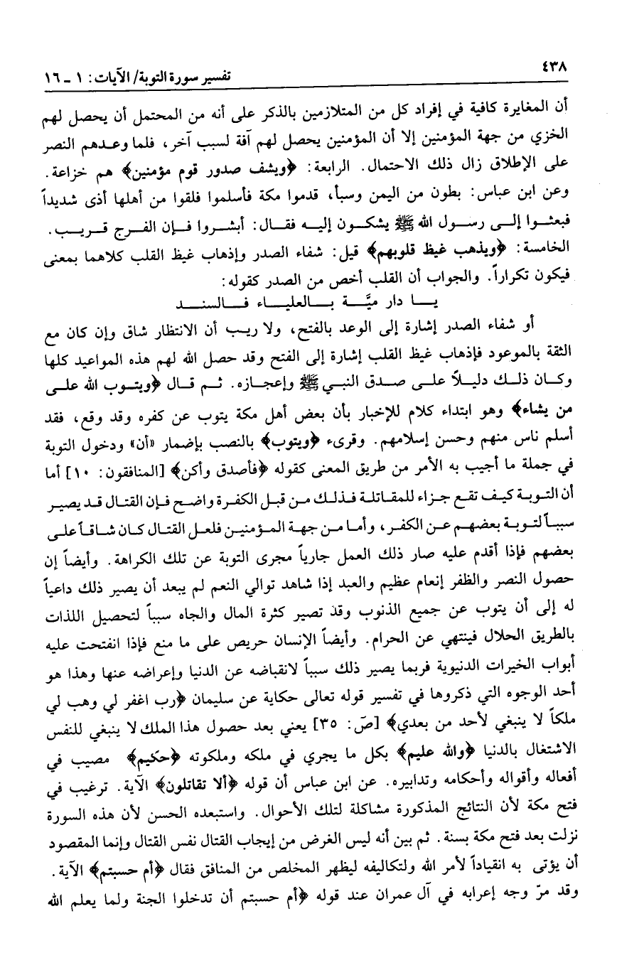 يا دار ميّة بالعلياء فالسند أو شفاء الصدر إشارة إلى الوعد بالفتح، ولا ريب أن الانتظار شاق وإن كان مع الثقة بالموعود فإذهاب غيظ القلب إشارة إلى الفتح وقد حصل الله لهم هذه المواعيد كلها وكان ذلك دليلا على صدق النبي صلى الله عليه وسلم وإعجازه. ثم قال وَيَتُوبُ اللَّهُ عَلى مَنْ يَشاءُ وهو ابتداء كلام للإخبار بأن بعض أهل مكة يتوب عن كفره وقد وقع، فقد أسلم ناس منهم وحسن إسلامهم. وقرىء وَيَتُوبُ بالنصب بإضمار «أن» ودخول التوبة في جملة ما أجيب به الأمر من طريق المعنى كقوله فَأَصَّدَّقَ وَأَكُنْ [المنافقون: 10] أما أن التوبة كيف تقع جزاء للمقاتلة فذلك من قبل الكفرة واضح فإن القتال قد يصير سببا لتوبة بعضهم عن الكفر، وأما من جهة المؤمنين فلعل القتال كان شاقا على بعضهم فإذا أقدم عليه صار ذلك العمل جاريا مجرى التوبة عن تلك الكراهة. وأيضا إن حصول النصر والظفر إنعام عظيم والعبد إذا شاهد توالي النعم لم يبعد أن يصير ذلك داعيا له إلى أن يتوب عن جميع الذنوب وقد تصير كثرة المال والجاه سببا لتحصيل اللذات بالطريق الحلال فينتهي عن الحرام. وأيضا الإنسان حريص على ما منع فإذا انفتحت عليه أبواب الخيرات الدنيوية فربما يصير ذلك سببا لانقباضه عن الدنيا وإعراضه عنها وهذا هو أحد الوجوه التي ذكروها في تفسير قوله تعالى حكاية عن سليمان رَبِّ اغْفِرْ لِي وَهَبْ لِي مُلْكاً لا يَنْبَغِي لِأَحَدٍ مِنْ بَعْدِي [ص: 35] يعني بعد حصول هذا الملك لا ينبغي للنفس الاشتغال بالدنيا وَاللَّهُ عَلِيمٌ بكل ما يجري في ملكه وملكوته حَكِيمٌ مصيب في أفعاله وأقواله وأحكامه وتدابيره. عن ابن عباس أن قوله أَلا تُقاتِلُونَ الآية. ترغيب في فتح مكة لأن النتائج المذكورة مشاكلة لتلك الأحوال. واستبعده الحسن لأن هذه السورة نزلت بعد فتح مكة بسنة. ثم بين أنه ليس الغرض من إيجاب القتال نفس القتال وإنما المقصود أن يؤتى به انقيادا لأمر الله ولتكاليفه ليظهر المخلص من المنافق فقال أَمْ حَسِبْتُمْ الآية.