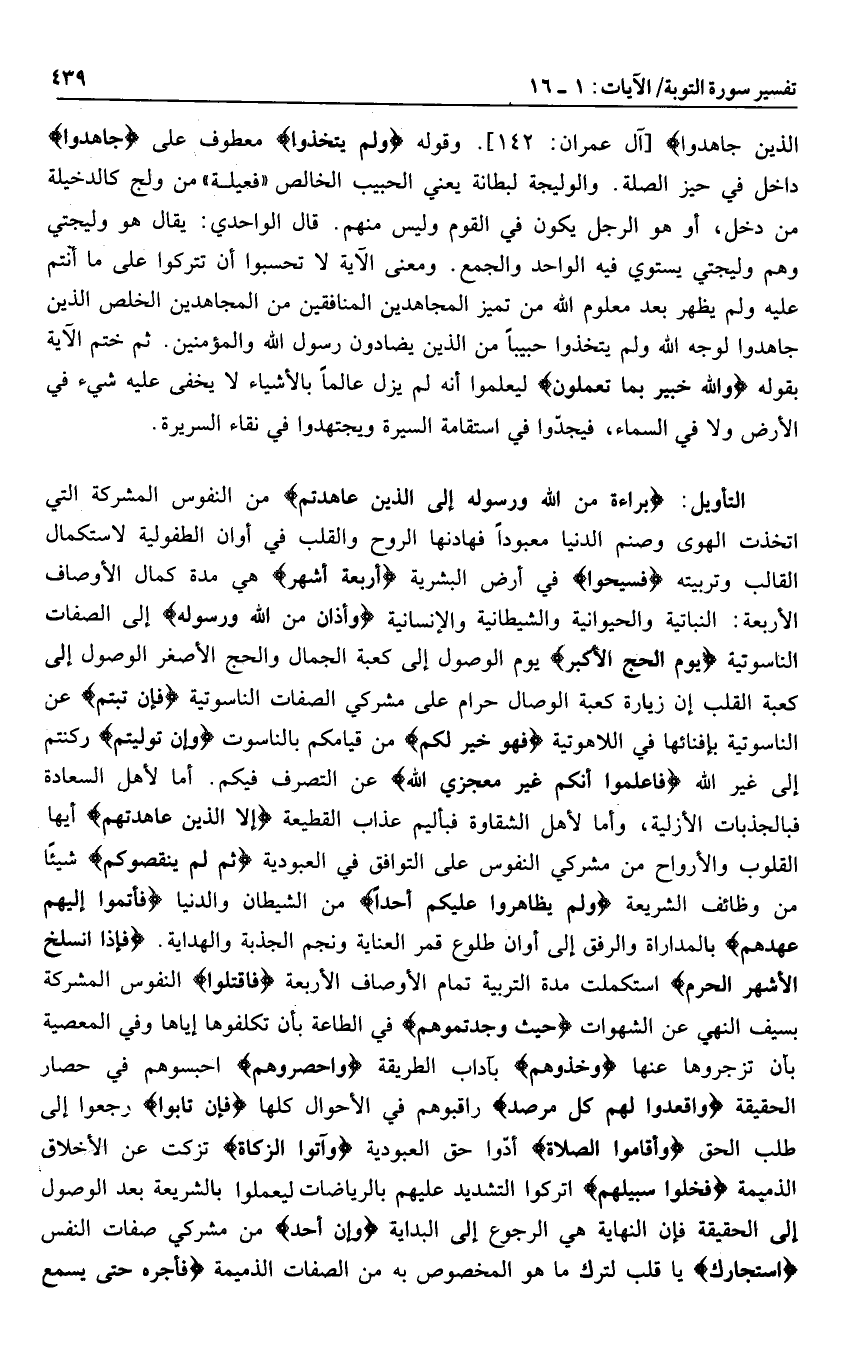 بَراءَةٌ مِنَ اللَّهِ وَرَسُولِهِ إِلَى الَّذِينَ عاهَدْتُمْ من النفوس المشركة التي اتخذت الهوى وصنم الدنيا معبودا فهادنها الروح والقلب في أوان الطفولية لاستكمال القالب وتربيته فَسِيحُوا في أرض البشرية أَرْبَعَةَ أَشْهُرٍ هي مدة كمال الأوصاف الأربعة: النباتية والحيوانية والشيطانية والإنسانية وَأَذانٌ مِنَ اللَّهِ وَرَسُولِهِ إلى الصفات الناسوتية يَوْمَ الْحَجِّ الْأَكْبَرِ يوم الوصول إلى كعبة الجمال والحج الأصغر الوصول إلى كعبة القلب إن زيارة كعبة الوصال حرام على مشركي الصفات الناسوتية فَإِنْ تُبْتُمْ عن الناسوتية بإفنائها في اللاهوتية فَهُوَ خَيْرٌ لَكُمْ من قيامكم بالناسوت وَإِنْ تَوَلَّيْتُمْ ركنتم إلى غير الله فَاعْلَمُوا أَنَّكُمْ غَيْرُ مُعْجِزِي اللَّهِ عن التصرف فيكم. أما لأهل السعادة فبالجذبات الأزلية، وأما لأهل الشقاوة فبأليم عذاب القطيعة إِلَّا الَّذِينَ عاهَدْتُمْ أيها القلوب والأرواح من مشركي النفوس على التوافق في العبودية ثُمَّ لَمْ يَنْقُصُوكُمْ شيئا من وظائف الشريعة وَلَمْ يُظاهِرُوا عَلَيْكُمْ أَحَداً من الشيطان والدنيا فَأَتِمُّوا إِلَيْهِمْ عَهْدَهُمْ بالمداراة والرفق إلى أوان طلوع قمر العناية ونجم الجذبة والهداية. فَإِذَا انْسَلَخَ الْأَشْهُرُ الْحُرُمُ استكملت مدة التربية تمام الأوصاف الأربعة فَاقْتُلُوا النفوس المشركة بسيف النهي عن الشهوات حَيْثُ وَجَدْتُمُوهُمْ في الطاعة بأن تكلفوها إياها وفي المعصية بأن تزجروها عنها وَخُذُوهُمْ بآداب الطريقة وَاحْصُرُوهُمْ احبسوهم في حصار الحقيقة وَاقْعُدُوا لَهُمْ كُلَّ مَرْصَدٍ راقبوهم في الأحوال كلها فَإِنْ تابُوا رجعوا إلى طلب الحق وَأَقامُوا الصَّلاةَ أدّوا حق العبودية وَآتَوُا الزَّكاةَ تزكت عن الأخلاق الذميمة فَخَلُّوا سَبِيلَهُمْ اتركوا التشديد عليهم بالرياضات ليعملوا بالشريعة بعد الوصول إلى الحقيقة فإن النهاية هي الرجوع إلى البداية وَإِنْ أَحَدٌ من مشركي صفات النفس اسْتَجارَكَ يا قلب لترك ما هو المخصوص به من الصفات الذميمة فَأَجِرْهُ حَتَّى يَسْمَعَ
