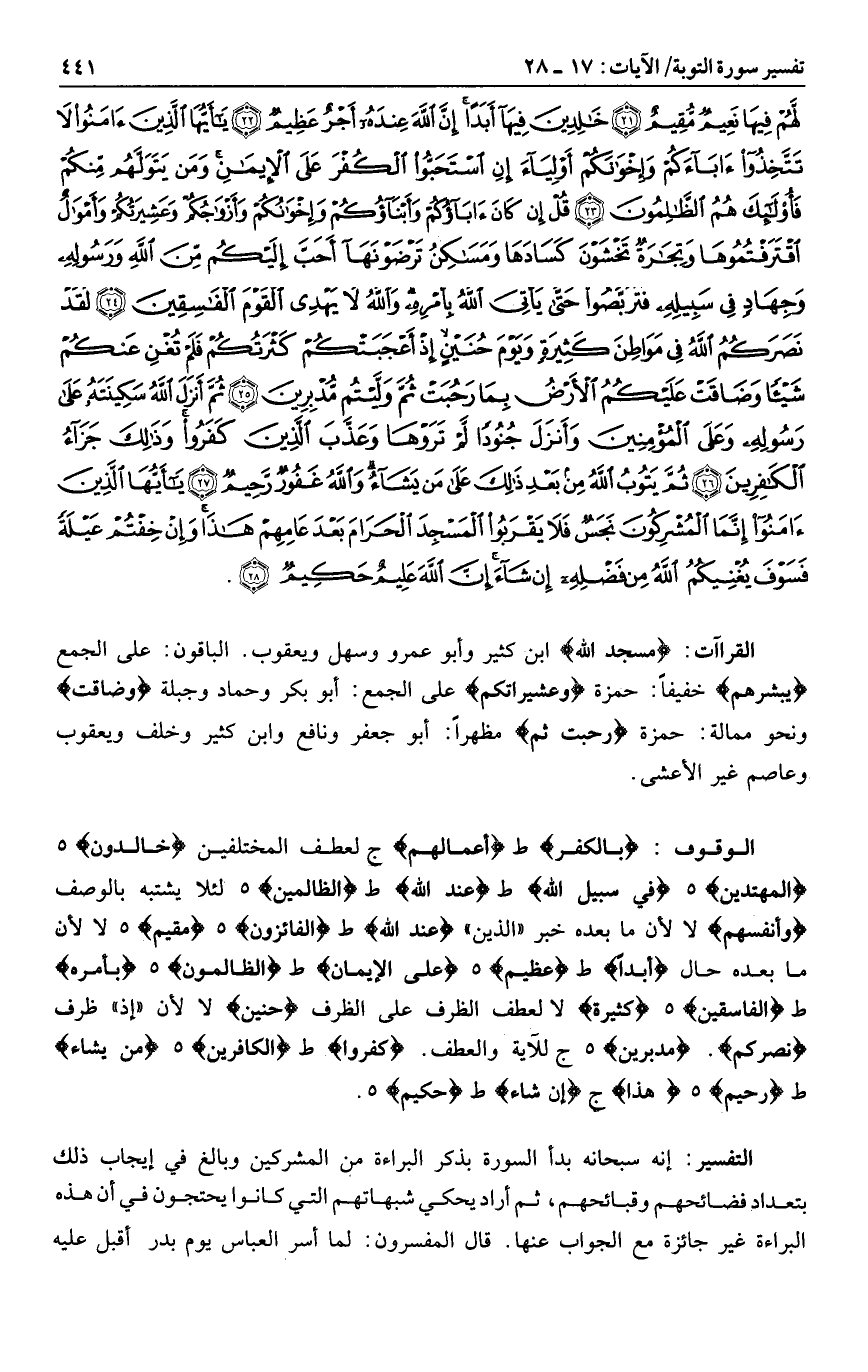 بِالْكُفْرِ ط أَعْمالُهُمْ ج لعطف المختلفين خالِدُونَ هـ الْمُهْتَدِينَ هـ فِي سَبِيلِ اللَّهِ ط عِنْدَ اللَّهِ ط الظَّالِمِينَ هـ لئلا يشتبه بالوصف وَأَنْفُسِهِمْ لا لأن ما بعده خبر «الذين» عِنْدَ اللَّهِ ط الْفائِزُونَ هـ مُقِيمٌ هـ لا لأن ما بعده حال أَبَداً ط عَظِيمٌ هـ عَلَى الْإِيمانِ ط الظَّالِمُونَ هـ بِأَمْرِهِ ط الْفاسِقِينَ هـ كَثِيرَةٍ لا لعطف الظرف على الظرف حُنَيْنٍ لا لأن «إذ» ظرف نَصَرَكُمُ. مُدْبِرِينَ هـ ج للآية والعطف. كَفَرُوا ط الْكافِرِينَ هـ مَنْ يَشاءُ ط رَحِيمٌ هـ هذا ج إِنْ شاءَ ط حَكِيمٌ هـ.