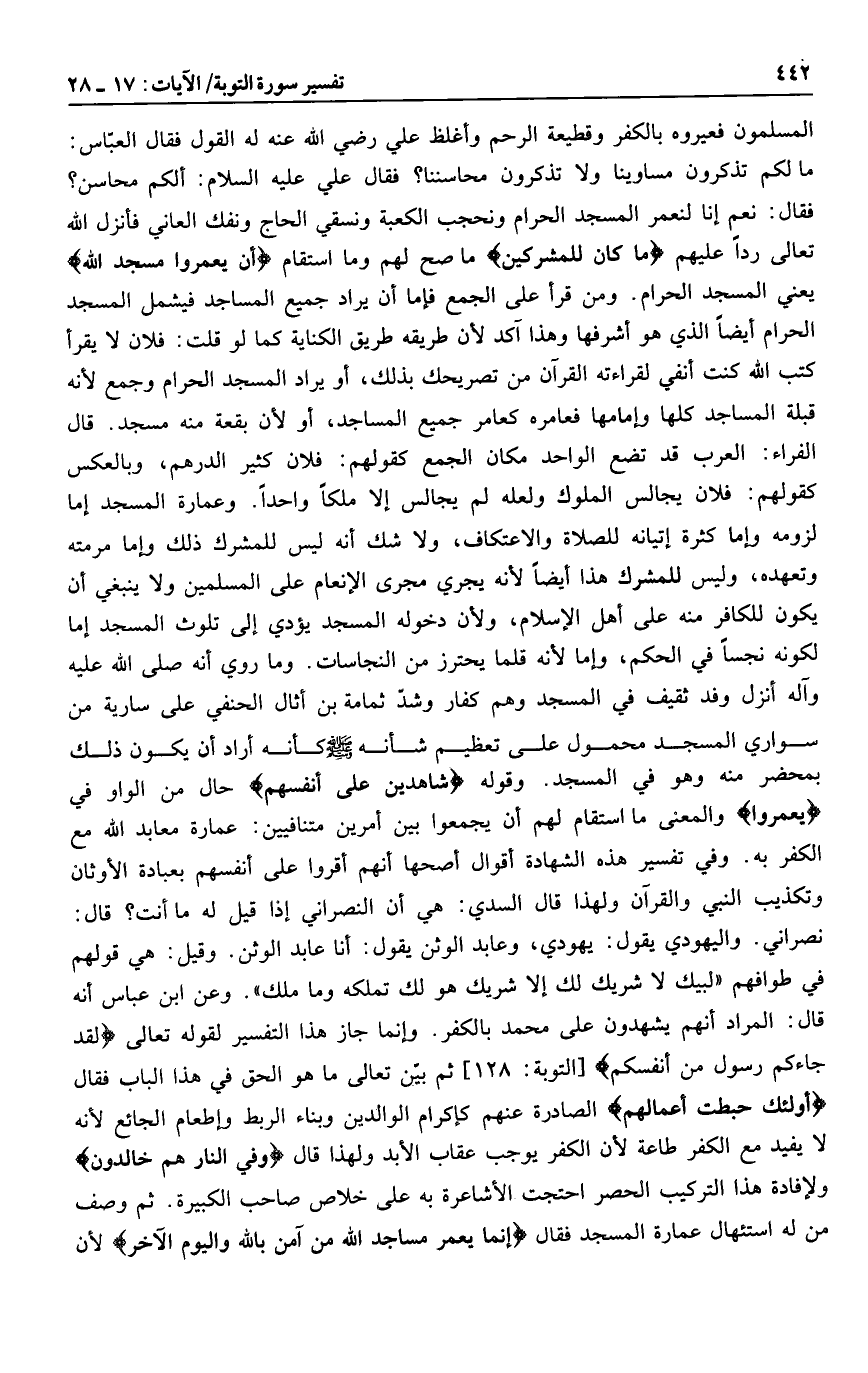 ما صح لهم وما استقام أن يعمروا مسجد الله يعني المسجد الحرام. ومن قرأ على الجمع فإما أن يراد جميع المساجد فيشمل المسجد الحرام أيضا الذي هو أشرفها وهذا آكد لأن طريقه طريق الكناية كما لو قلت: فلان لا يقرأ كتب الله كنت أنفي لقراءته القرآن من تصريحك بذلك، أو يراد المسجد الحرام وجمع لأنه قبلة المساجد كلها وإمامها فعامره كعامر جميع المساجد، أو لأن بقعة منه مسجد. قال الفراء: العرب قد تضع الواحد مكان الجمع كقولهم: فلان كثير الدرهم، وبالعكس كقولهم: فلان يجالس الملوك ولعله لم يجالس إلا ملكا واحدا. وعمارة المسجد إما لزومه وإما كثرة إتيانه للصلاة والاعتكاف، ولا شك أنه ليس للمشرك ذلك وإما مرمته وتعهده، وليس للمشرك هذا أيضا لأنه يجري مجرى الإنعام على المسلمين ولا ينبغي أن يكون للكافر منه على أهل الإسلام، ولأن دخوله المسجد يؤدي إلى تلوث المسجد إما لكونه نجسا في الحكم، وإما لأنه قلما يحترز من النجاسات. وما