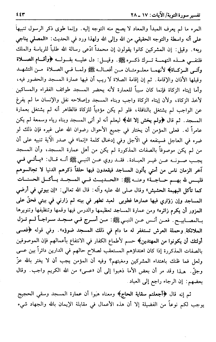 المرء ما لم يعرف المبدأ والمعاد لا يصح منه التوجه إليه. وإنما طوى ذكر الرسول تنبيها على أنه واسطة والتوجه الحقيقي من الله وإلى الله ولهذا ورد في الحديث: «المصلي يناجي ربه» . وقيل: إن المشركين كانوا يقولون إن محمدا ادّعى رسالة الله طلبا للرياسة والملك فلنفي هذه التهمة ترك ذكره صلى الله عليه وسلم. وقيل: دل عليه بقوله وَأَقامَ الصَّلاةَ وَآتَى الزَّكاةَ لأنهما معلومتان من أفعاله صلى الله عليه وسلم ولما في الصلاة من التشهد وقبلها الأذان والإقامة. ثم إن إقامة الصلاة لا ريب أن فيها عمارة المسجد والحضور فيه، وأما إيتاء الزكاة فإنما كان سببا للعمارة لأنه يحضر المسجد طوائف الفقراء والمساكين لأخذ الزكاة، ولأن إيتاء الزكاة واجب وبناء المسجد وإصلاحه نفل والإنسان ما لم يفرغ عن الواجب لم يشتغل بالنافلة، فلو لم يكن مؤديا للزكاة فالظاهر أنه لم يشتغل بعمارة المسجد. ثم قال وَلَمْ يَخْشَ إِلَّا اللَّهَ ليعلم أنه لو أتى المسجد وبناه رياء وسمعة لم يكن عامرا له. فعلى المؤمن أن يختار في جميع الأحوال رضوان الله على غيره فإن ذلك لو ضره في العاجل فسينفعه في الآجل وفي إدخال كلمة «إنما» في صدر الآية تنبيه على أن من لم يكن موصوفا بالصفات المذكورة لم يكن من أهل عمارة المسجد، وأن المسجد يجب صونه عن غير العبادة.