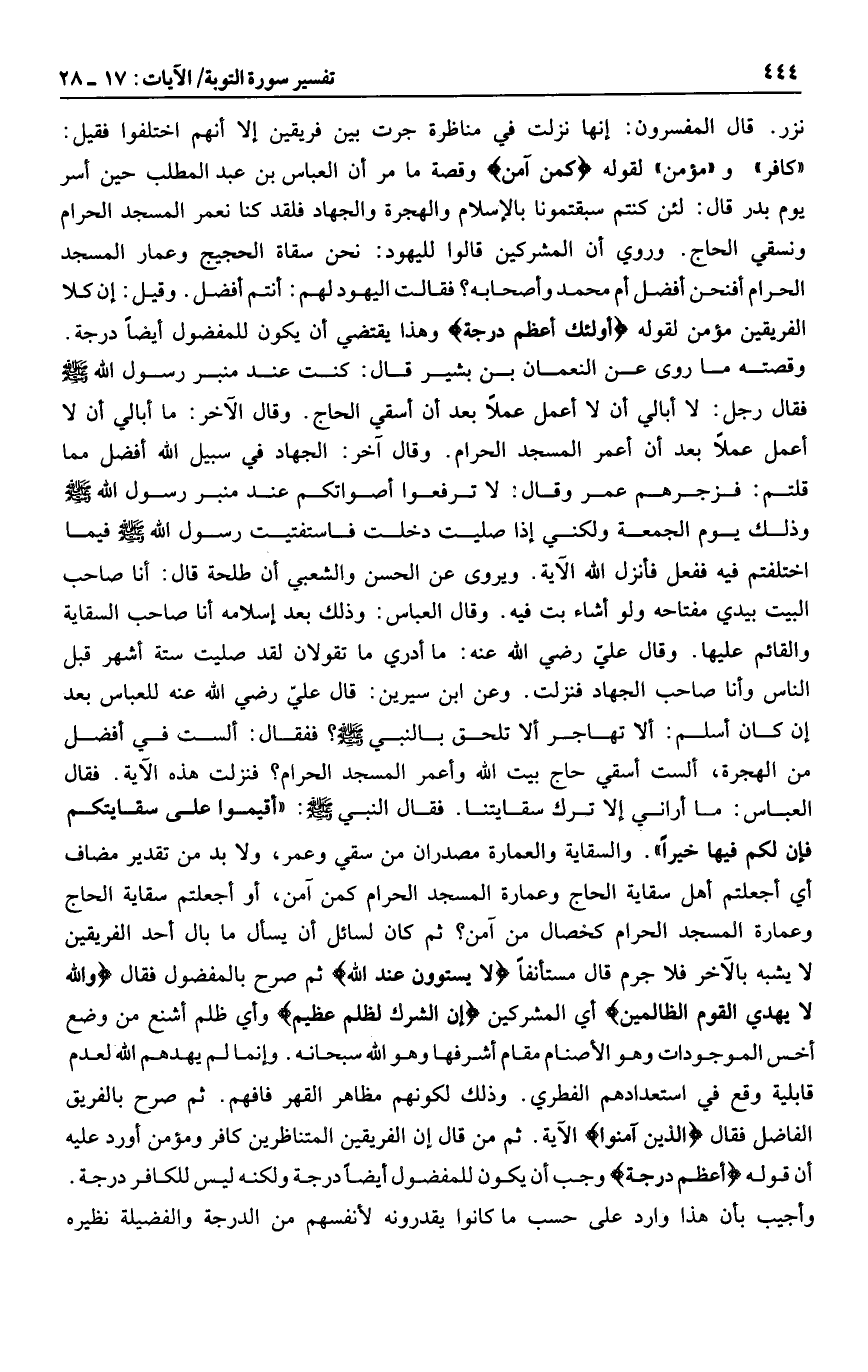 «كافر» و «مؤمن» لقوله كَمَنْ آمَنَ وقصة ما مر أن العباس بن عبد المطلب حين أسر يوم بدر قال: لئن كنتم سبقتمونا بالإسلام والهجرة والجهاد فلقد كنا نعمر المسجد الحرام ونسقي الحاج. وروي أن المشركين قالوا لليهود: نحن سقاة الحجيج وعمار المسجد الحرام أفنحن أفضل أم محمد وأصحابه؟ فقالت اليهود لهم: أنتم أفضل. وقيل: إن كلا الفريقين مؤمن لقوله أُولئِكَ أَعْظَمُ دَرَجَةً وهذا يقتضي أن يكون للمفضول أيضا درجة.