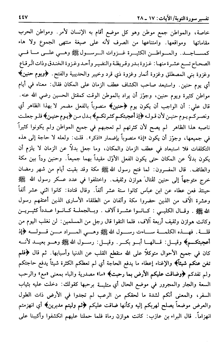 خاصة، والمواطن جمع موطن وهو كل موضع أقام به الإنسان لأمر. ومواطن الحرب مقاماتها ومواقعها. وامتناعها من الصرف لأنه على صيغة منتهى الجموع ولا هاء كمساجد. والمواطن الكثيرة غزوات الرسول صلى الله عليه وسلم وهي على ما في الصحاح تسع عشرة منها: غزوة بدر وقريظة والنضير وأحد وغزوة الخندق وذات الرقاع وغزوة بني المصطلق وغزوة أنمار وغزوة ذي قرد وخيبر والحديبية والفتح. وَيَوْمَ حُنَيْنٍ أي يوم حنين. واستبعد صاحب الكشاف عطف الزمان على المكان فقال: معناه في أيام مواطن كثيرة ويوم حنين، وجوّز أن يراد بالموطن الوقت كمقتل الحسين رضي الله عنه.