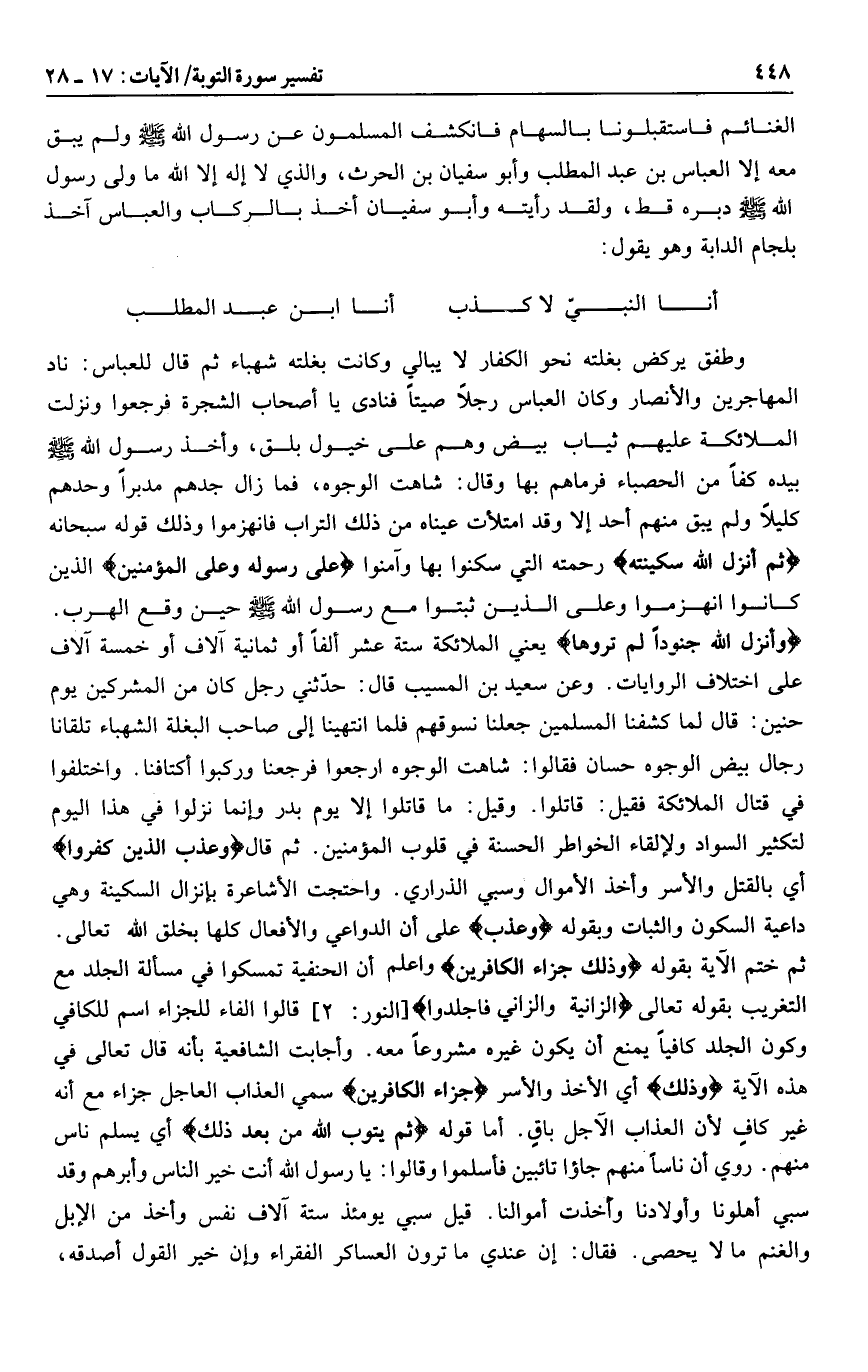 أنا النبيّ لا كذب أنا ابن عبد المطلب وطفق يركض بغلته نحو الكفار لا يبالي وكانت بغلته شهباء ثم قال للعباس: ناد المهاجرين والأنصار وكان العباس رجلا صيتا فنادى يا أصحاب الشجرة فرجعوا ونزلت الملائكة عليهم ثياب بيض وهم على خيول بلق، وأخذ رسول الله صلى الله عليه وسلم بيده كفا من الحصباء فرماهم بها وقال: شاهت الوجوه، فما زال جدهم مدبرا وحدهم كليلا ولم يبق منهم أحد إلا وقد امتلأت عيناه من ذلك التراب فانهزموا