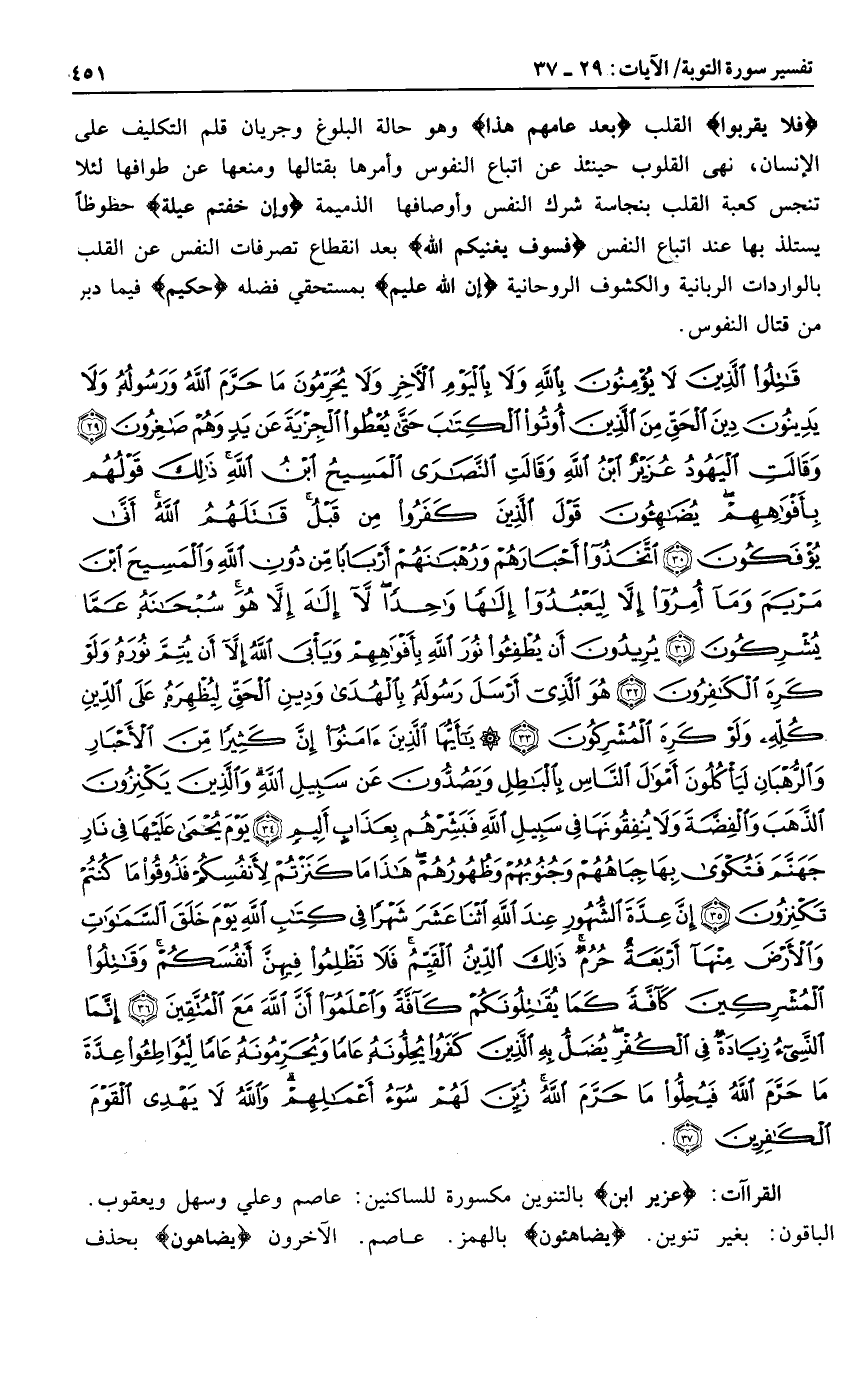 قاتِلُوا الَّذِينَ لا يُؤْمِنُونَ بِاللَّهِ وَلا بِالْيَوْمِ الْآخِرِ وَلا يُحَرِّمُونَ ما حَرَّمَ اللَّهُ وَرَسُولُهُ وَلا يَدِينُونَ دِينَ الْحَقِّ مِنَ الَّذِينَ أُوتُوا الْكِتابَ حَتَّى يُعْطُوا الْجِزْيَةَ عَنْ يَدٍ وَهُمْ صاغِرُونَ (29) وَقالَتِ الْيَهُودُ عُزَيْرٌ ابْنُ اللَّهِ وَقالَتِ النَّصارى الْمَسِيحُ ابْنُ اللَّهِ ذلِكَ قَوْلُهُمْ بِأَفْواهِهِمْ يُضاهِؤُنَ قَوْلَ الَّذِينَ كَفَرُوا مِنْ قَبْلُ قاتَلَهُمُ اللَّهُ أَنَّى يُؤْفَكُونَ (30) اتَّخَذُوا أَحْبارَهُمْ وَرُهْبانَهُمْ أَرْباباً مِنْ دُونِ اللَّهِ وَالْمَسِيحَ ابْنَ مَرْيَمَ وَما أُمِرُوا إِلاَّ لِيَعْبُدُوا إِلهاً واحِداً لا إِلهَ إِلاَّ هُوَ سُبْحانَهُ عَمَّا يُشْرِكُونَ (31) يُرِيدُونَ أَنْ يُطْفِؤُا نُورَ اللَّهِ بِأَفْواهِهِمْ وَيَأْبَى اللَّهُ إِلاَّ أَنْ يُتِمَّ نُورَهُ وَلَوْ كَرِهَ الْكافِرُونَ (32) هُوَ الَّذِي أَرْسَلَ رَسُولَهُ بِالْهُدى وَدِينِ الْحَقِّ لِيُظْهِرَهُ عَلَى الدِّينِ كُلِّهِ وَلَوْ كَرِهَ الْمُشْرِكُونَ (33)