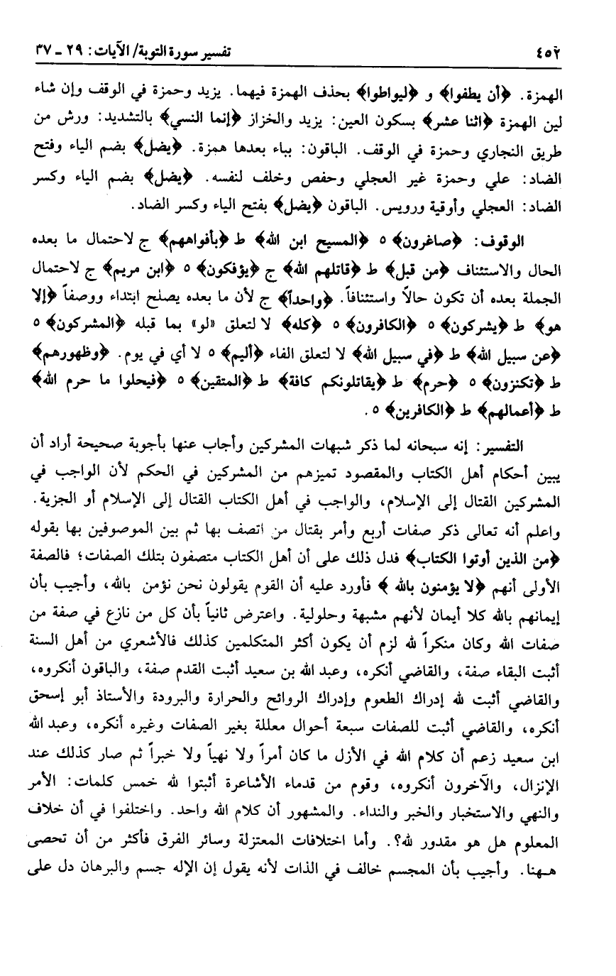 واعلم أنه تعالى ذكر صفات أربع وأمر بقتال من اتصف بها ثم بين الموصوفين بها بقوله مِنَ الَّذِينَ أُوتُوا الْكِتابَ فدل ذلك على أن أهل الكتاب متصفون بتلك الصفات فالصفة الأولى أنهم لا يُؤْمِنُونَ بِاللَّهِ فأورد عليه أن القوم يقولون نحن نؤمن بالله، وأجيب بأن إيمانهم بالله كلا أيمان لأنهم مشبهة وحلولية. واعترض ثانيا بأن كل من نازع في صفة من صفات الله وكان منكرا لله لزم أن يكون أكثر المتكلمين كذلك فالأشعري من أهل السنة أثبت البقاء صفة، والقاضي أنكره، وعبد الله بن سعيد أثبت القدم صفة، والباقون أنكروه، والقاضي أثبت لله إدراك الطعوم وإدراك الروائح والحرارة والبرودة والأستاذ أبو إسحق أنكره، والقاضي أثبت للصفات سبعة أحوال معللة بغير الصفات وغيره أنكره، وعبد الله ابن سعيد زعم أن كلام الله في الأزل ما كان أمرا ولا نهيا ولا خبرا ثم صار كذلك عند الإنزال، والآخرون أنكروه، وقوم من قدماء الأشاعرة أثبتوا لله خمس كلمات: الأمر والنهي والاستخبار والخبر والنداء. والمشهور أن كلام الله واحد. واختلفوا في أن خلاف المعلوم هل هو مقدور لله؟. وأما اختلافات المعتزلة وسائر الفرق فأكثر من أن تحصى هاهنا. وأجيب بأن المجسم خالف في الذات لأنه يقول إن الإله جسم والبرهان دل على