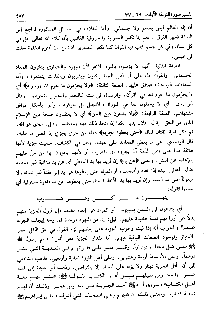 الصفة الثانية: أنهم لا يؤمنون باليوم الآخر لأن اليهود والنصارى ينكرون المعاد الجسماني. والقرآن دل على أن أهل الجنة يأكلون ويشربون وباللذات يتمتعون، وأما السعادات الروحانية فمتفق عليها. الصفة الثالثة: وَلا يُحَرِّمُونَ ما حَرَّمَ اللَّهُ وَرَسُولُهُ أي لا يحرّمون ما حرم الله في القرآن، والرسول في سنته كالخمر والخنزير ونحوهما. وقال أبو روق: أي لا يعملون بما في التوراة والإنجيل بل حرفوهما وأتوا بأحكام توافق مشتهاهم. الصفة الرابعة: وَلا يَدِينُونَ دِينَ الْحَقِّ أي لا يعتقدون صحة دين الإسلام الذي هو الحق. يقال: فلان يدين بكذا إذا اتخذ ذلك دينه ومعتقده. وقيل: الحق هو الله.