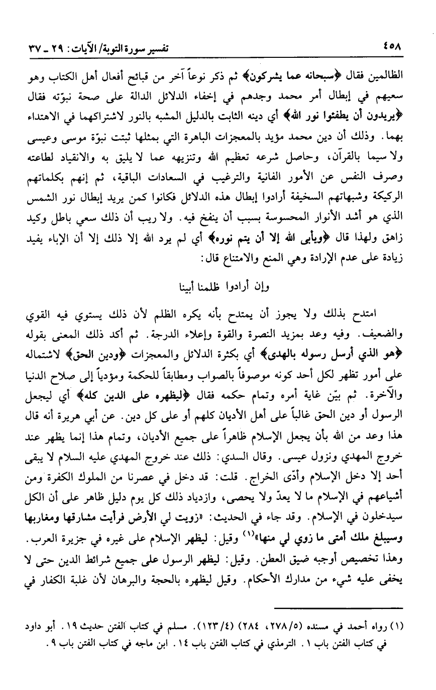 الظالمين فقال سُبْحانَهُ عَمَّا يُشْرِكُونَ ثم ذكر نوعا آخر من قبائح أفعال أهل الكتاب وهو سعيهم في إبطال أمر محمد وجدهم في إخفاء الدلائل الدالة على صحة نبوّته فقال يُرِيدُونَ أَنْ يُطْفِؤُا نُورَ اللَّهِ أي دينه الثابت بالدليل المشبه بالنور لاشتراكهما في الاهتداء بهما. وذلك أن دين محمد مؤيد بالمعجزات الباهرة التي بمثلها ثبتت نبوّة موسى وعيسى ولا سيما بالقرآن، وحاصل شرعه تعظيم الله وتنزيهه عما لا يليق به والانقياد لطاعته وصرف النفس عن الأمور الفانية والترغيب في السعادات الباقية، ثم إنهم بكلماتهم الركيكة وشبهاتهم السخيفة أرادوا إبطال هذه الدلائل فكانوا كمن يريد إبطال نور الشمس الذي هو أشد الأنوار المحسوسة بسبب أن ينفخ فيه. ولا ريب أن ذلك سعي باطل وكيد زاهق ولهذا قال وَيَأْبَى اللَّهُ إِلَّا أَنْ يُتِمَّ نُورَهُ أي لم يرد الله إلا ذلك إلا أن الإباء يفيد زيادة على عدم الإرادة وهي المنع والامتناع قال: