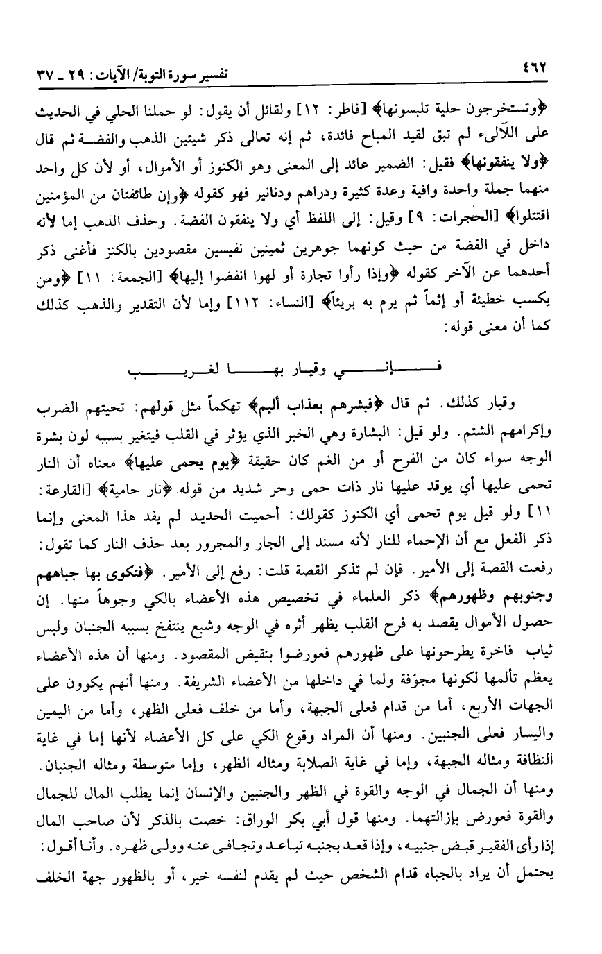 ومنها أن الجمال في الوجه والقوة في الظهر والجنبين والإنسان إنما يطلب المال للجمال والقوة فعورض بإزالتهما. ومنها قول أبي بكر الوراق: خصت بالذكر لأن صاحب المال إذا رأى الفقير قبض جنبيه، وإذا قعد بجنبه تباعد وتجافى عنه وولى ظهره. وأنا أقول: