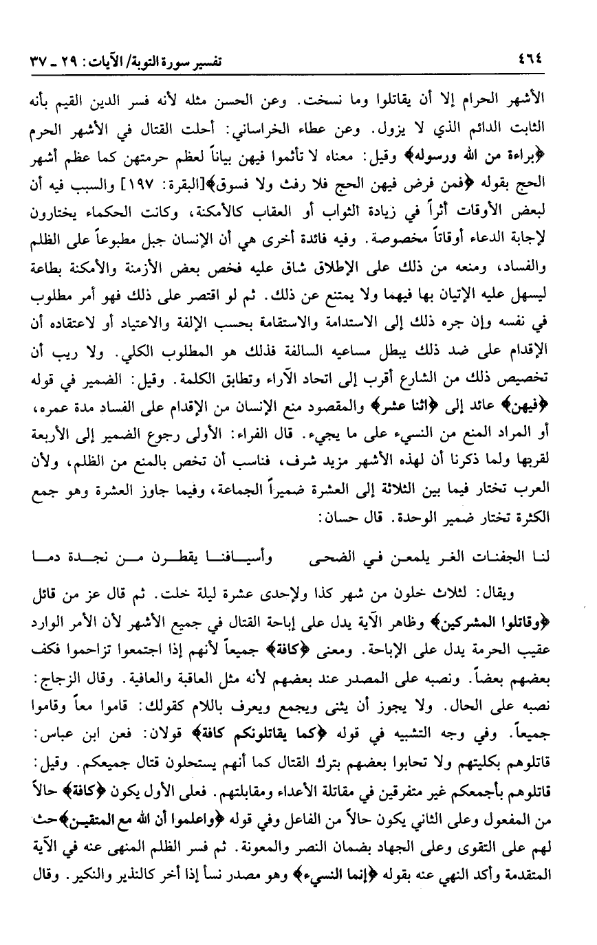 الأشهر الحرام إلا أن يقاتلوا وما نسخت. وعن الحسن مثله لأنه فسر الدين القيم بأنه الثابت الدائم الذي لا يزول. وعن عطاء الخراساني: أحلت القتال في الأشهر الحرم بَراءَةٌ مِنَ اللَّهِ وَرَسُولِهِ وقيل: معناه لا تأثموا فيهن بيانا لعظم حرمتهن كما عظم أشهر الحج بقوله فَمَنْ فَرَضَ فِيهِنَّ الْحَجَّ فَلا رَفَثَ وَلا فُسُوقَ [البقرة: 197] والسبب فيه أن لبعض الأوقات أثرا في زيادة الثواب أو العقاب كالأمكنة، وكانت الحكماء يختارون لإجابة الدعاء أوقاتا مخصوصة. وفيه فائدة أخرى هي أن الإنسان جبل مطبوعا على الظلم والفساد، ومنعه من ذلك على الإطلاق شاق عليه فخص بعض الأزمنة والأمكنة بطاعة ليسهل عليه الإتيان بها فيهما ولا يمتنع عن ذلك. ثم لو اقتصر على ذلك فهو أمر مطلوب في نفسه وإن جره ذلك إلى الاستدامة والاستقامة بحسب الإلفة والاعتياد أو لاعتقاده أن الإقدام على ضد ذلك يبطل مساعيه السالفة فذلك هو المطلوب الكلي. ولا ريب أن تخصيص ذلك من الشارع أقرب إلى اتحاد الآراء وتطابق الكلمة. وقيل: الضمير في قوله فِيهِنَّ عائد إلى اثْنا عَشَرَ والمقصود منع الإنسان من الإقدام على الفساد مدة عمره، أو المراد المنع من النسيء على ما يجيء. قال الفراء: الأولى رجوع الضمير إلى الأربعة لقربها ولما ذكرنا أن لهذه الأشهر مزيد شرف، فناسب أن تخص بالمنع من الظلم، ولأن العرب تختار فيما بين الثلاثة إلى العشرة ضميرا الجماعة، وفيما جاوز العشرة وهو جمع الكثرة تختار ضمير الوحدة. قال حسان: