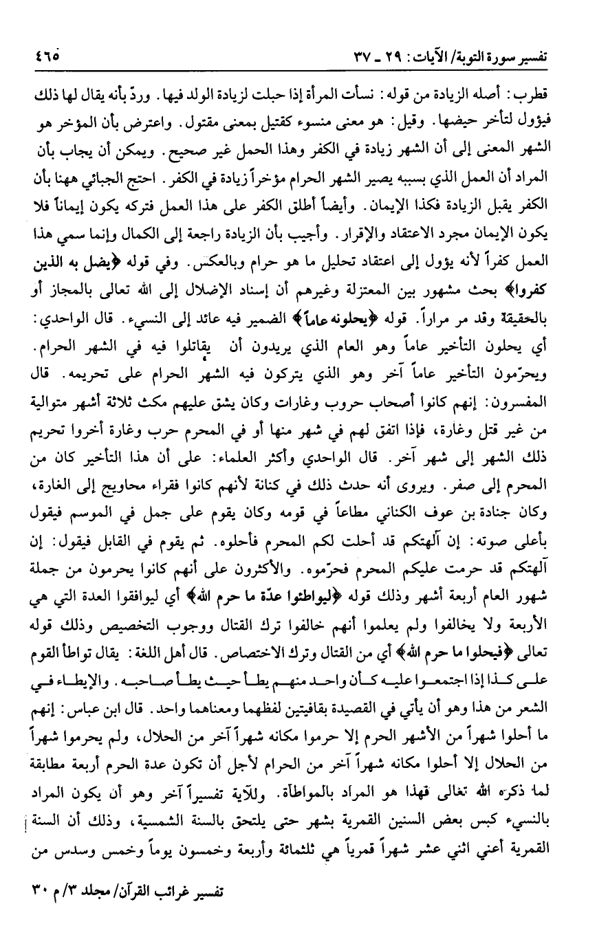 قطرب: أصله الزيادة من قوله: نسأت المرأة إذا حبلت لزيادة الولد فيها. وردّ بأنه يقال لها ذلك فيؤول لتأخر حيضها. وقيل: هو معنى منسوء كقتيل بمعنى مقتول. واعترض بأن المؤخر هو الشهر المعنى إلى أن الشهر زيادة في الكفر وهذا الحمل غير صحيح. ويمكن أن يجاب بأن المراد أن العمل الذي بسببه يصير الشهر الحرام مؤخرا زيادة في الكفر. احتج الجبائي هاهنا بأن الكفر يقبل الزيادة فكذا الإيمان. وأيضا أطلق الكفر على هذا العمل فتركه يكون إيمانا فلا يكون الإيمان مجرد الاعتقاد والإقرار. وأجيب بأن الزيادة راجعة إلى الكمال وإنما سمي هذا العمل كفرا لأنه يؤول إلى اعتقاد تحليل ما هو حرام وبالعكس. وفي قوله يُضَلُّ بِهِ الَّذِينَ كَفَرُوا بحث مشهور بين المعتزلة وغيرهم أن إسناد الإضلال إلى الله تعالى بالمجاز أو بالحقيقة وقد مر مرارا. قوله يُحِلُّونَهُ عاماً الضمير فيه عائد إلى النسيء. قال الواحدي: