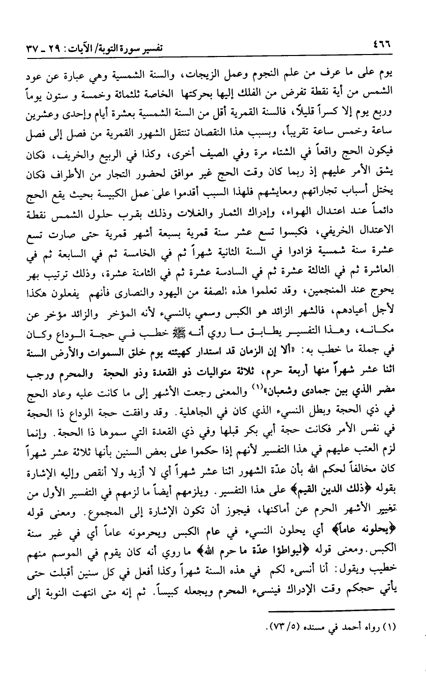 يوم على ما عرف من علم النجوم وعمل الزيجات، والسنة الشمسية وهي عبارة عن عود الشمس من أية نقطة تفرض من الفلك إليها بحركتها الخاصة ثلاثمائة وخمسة وستون يوما وربع يوم إلا كسرا قليلا، فالسنة القمرية أقل من السنة الشمسية بعشرة أيام وإحدى وعشرين ساعة وخمس ساعة تقريبا، وبسبب هذا النقصان تنتقل الشهور القمرية من فصل إلى فصل فيكون الحج واقعا في الشتاء مرة وفي الصيف أخرى، وكذا في الربيع والخريف، فكان يشق الأمر عليهم إذ ربما كان وقت الحج غير موافق لحضور التجار من الأطراف فكان يختل أسباب تجاراتهم ومعايشهم فلهذا السبب أقدموا على عمل الكبيسة بحيث يقع الحج دائما عند اعتدال الهواء، وإدراك الثمار والغلات وذلك بقرب حلول الشمس نقطة الاعتدال الخريفي، فكبسوا تسع عشر سنة قمرية بسبعة أشهر قمرية حتى صارت تسع عشرة سنة شمسية فزادوا في السنة الثانية شهرا ثم في الخامسة ثم في السابعة ثم في العاشرة ثم في الثالثة عشرة ثم في السادسة عشرة ثم في الثامنة عشرة، وذلك ترتيب بهر يحوج عند المنجمين، وقد تعلموا هذه الصفة من اليهود والنصارى فأنهم يفعلون هكذا لأجل أعيادهم، فالشهر الزائد هو الكبس وسمي بالنسيء لأنه المؤخر والزائد مؤخر عن مكانه، وهذا التفسير يطابق ما