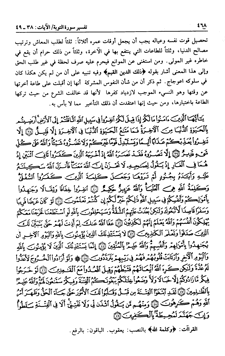 يا أَيُّهَا الَّذِينَ آمَنُوا ما لَكُمْ إِذا قِيلَ لَكُمُ انْفِرُوا فِي سَبِيلِ اللَّهِ اثَّاقَلْتُمْ إِلَى الْأَرْضِ أَرَضِيتُمْ بِالْحَياةِ الدُّنْيا مِنَ الْآخِرَةِ فَما مَتاعُ الْحَياةِ الدُّنْيا فِي الْآخِرَةِ إِلاَّ قَلِيلٌ (38) إِلاَّ تَنْفِرُوا يُعَذِّبْكُمْ عَذاباً أَلِيماً وَيَسْتَبْدِلْ قَوْماً غَيْرَكُمْ وَلا تَضُرُّوهُ شَيْئاً وَاللَّهُ عَلى كُلِّ شَيْءٍ قَدِيرٌ (39) إِلاَّ تَنْصُرُوهُ فَقَدْ نَصَرَهُ اللَّهُ إِذْ أَخْرَجَهُ الَّذِينَ كَفَرُوا ثانِيَ اثْنَيْنِ إِذْ هُما فِي الْغارِ إِذْ يَقُولُ لِصاحِبِهِ لا تَحْزَنْ إِنَّ اللَّهَ مَعَنا فَأَنْزَلَ اللَّهُ سَكِينَتَهُ عَلَيْهِ وَأَيَّدَهُ بِجُنُودٍ لَمْ تَرَوْها وَجَعَلَ كَلِمَةَ الَّذِينَ كَفَرُوا السُّفْلى وَكَلِمَةُ اللَّهِ هِيَ الْعُلْيا وَاللَّهُ عَزِيزٌ حَكِيمٌ (40) انْفِرُوا خِفافاً وَثِقالاً وَجاهِدُوا بِأَمْوالِكُمْ وَأَنْفُسِكُمْ فِي سَبِيلِ اللَّهِ ذلِكُمْ خَيْرٌ لَكُمْ إِنْ كُنْتُمْ تَعْلَمُونَ (41) لَوْ كانَ عَرَضاً قَرِيباً وَسَفَراً قاصِداً لاتَّبَعُوكَ وَلكِنْ بَعُدَتْ عَلَيْهِمُ الشُّقَّةُ وَسَيَحْلِفُونَ بِاللَّهِ لَوِ اسْتَطَعْنا لَخَرَجْنا مَعَكُمْ يُهْلِكُونَ أَنْفُسَهُمْ وَاللَّهُ يَعْلَمُ إِنَّهُمْ لَكاذِبُونَ (42)