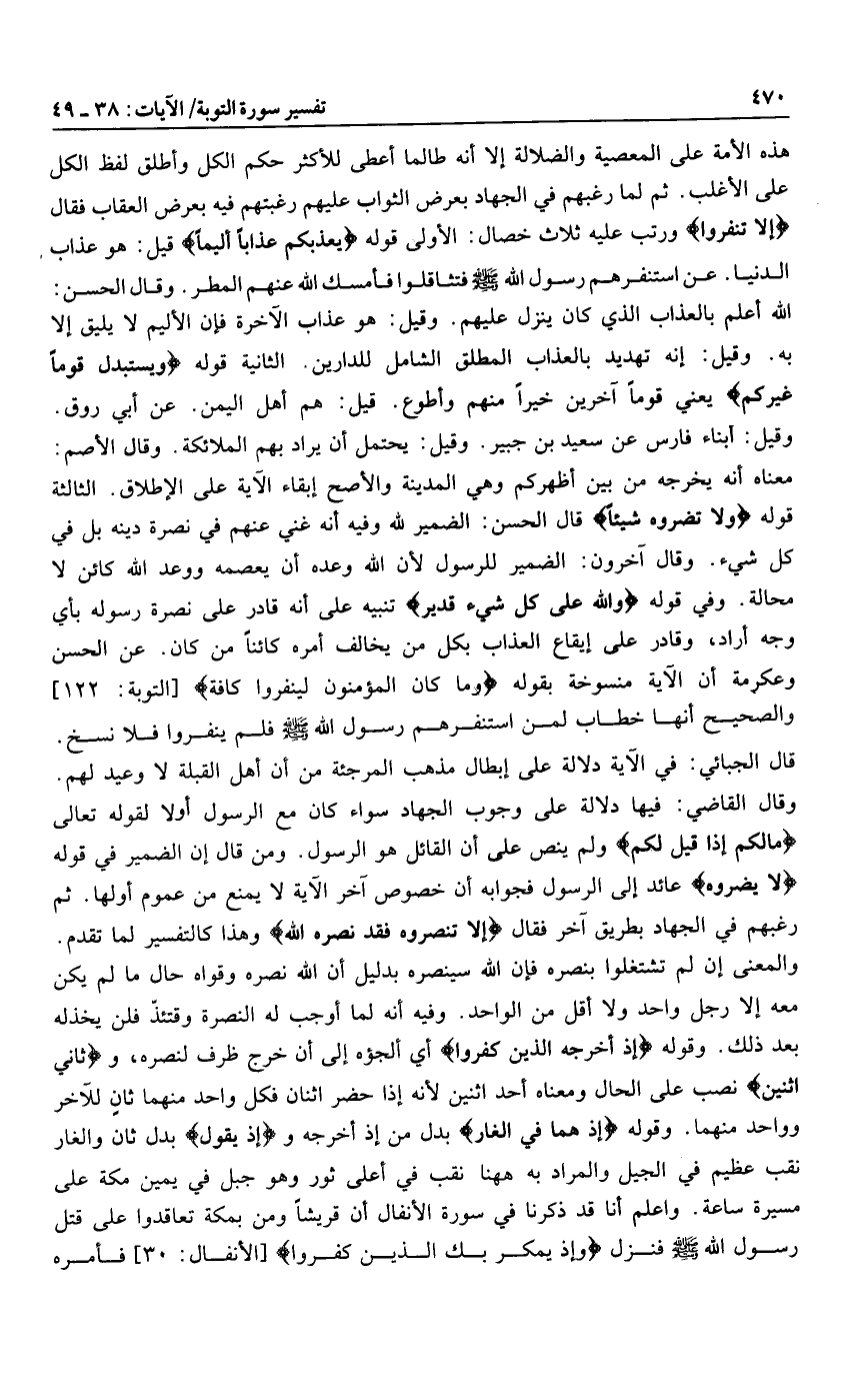 وقال القاضي: فيها دلالة على وجوب الجهاد سواء كان مع الرسول أولا لقوله تعالى ما لَكُمْ إِذا قِيلَ لَكُمُ ولم ينص على أن القائل هو الرسول. ومن قال إن الضمير في قوله لا تَضُرُّوهُ عائد إلى الرسول فجوابه أن خصوص آخر الآية لا يمنع من عموم أولها. ثم رغبهم في الجهاد بطريق آخر فقال إِلَّا تَنْصُرُوهُ فَقَدْ نَصَرَهُ اللَّهُ وهذا كالتفسير لما تقدم.