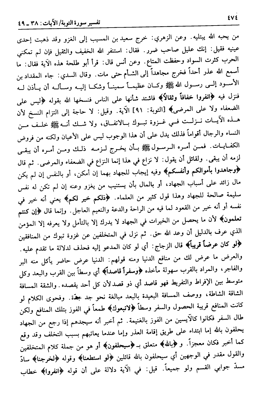وقيل: لا حاجة إلى التزام النسخ لأن هذه الآيات نزلت في غزوة تبوك بالاتفاق، ولا شك أنه صلى الله عليه وسلم خلف من النساء والرجال أقواما فذلك يدل على أن هذا الوجوب ليس على الأعيان ولكنه من فروض الكفايات. فمن أمره الرسول صلى الله عليه وسلم بأن يخرج لزمه ذلك ومن أمره أن يبقى لزمه أن يبقى. ولقائل أن يقول: لا نزاع في هذا إنما النزاع في الضعفاء والمرضى. ثم قال وَجاهِدُوا بِأَمْوالِكُمْ وَأَنْفُسِكُمْ وفيه إيجاب للجهاد بهما إن أمكن، أو بالنفس إن لم يكن مال زائد على أسباب الجهاد، أو بالمال بأن يستنيب من يغزو وعنه إن لم تكن له نفس سليمة صالحة للجهاد وهذا قول كثير من العلماء. ذلِكُمْ خَيْرٌ لَكُمْ يعني أنه خير في نفسه أو أنه خير من القعود لما فيه من الراحة والدعة والنعيم العاجل. وإنما قال إِنْ كُنْتُمْ تَعْلَمُونَ لأن ما يحصل من الخيرات في الجهاد لا يدرك إلا بالتأمل ولا يعرفه إلا المؤمن الذي عرف بالدليل أن وعد الله حق. ثم نزل في المتخلفين عن غزوة تبوك من المنافقين لَوْ كانَ عَرَضاً قَرِيباً قال الزجاج: أي لو كان المدعو إليه فحذف لدلالة ما تقدم عليه.
