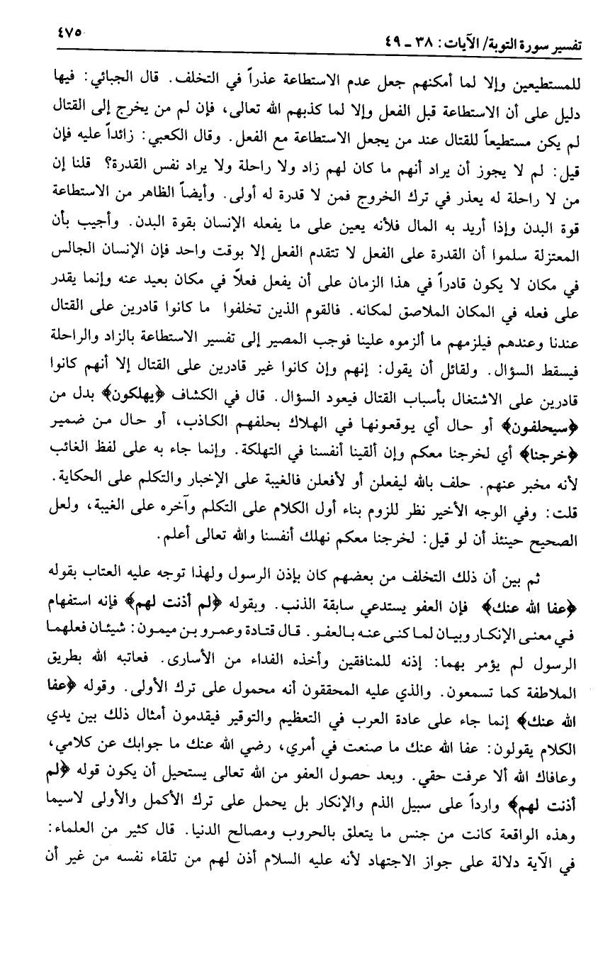 ثم بين أن ذلك التخلف من بعضهم كان بإذن الرسول ولهذا توجه عليه العتاب بقوله عَفَا اللَّهُ عَنْكَ فإن العفو يستدعي سابقة الذنب. وبقوله لِمَ أَذِنْتَ لَهُمْ فإنه استفهام في معنى الإنكار وبيان لما كنى عنه بالعفو. قال قتادة وعمرو بن ميمون: شيئان فعلهما الرسول لم يؤمر بهما: إذنه للمنافقين وأخذه الفداء من الأسارى. فعاتبه الله بطريق الملاطفة كما تسمعون. والذي عليه المحققون أنه محمول على ترك الأولى. وقوله عَفَا اللَّهُ عَنْكَ إنما جاء على عادة العرب في التعظيم والتوقير فيقدمون أمثال ذلك بين يدي الكلام يقولون: عفا الله عنك ما صنعت في أمري، رضي الله عنك ما جوابك عن كلامي، وعافاك الله ألا عرفت حقي. وبعد حصول العفو من الله تعالى يستحيل أن يكون قوله لِمَ أَذِنْتَ لَهُمْ واردا على سبيل الذم والإنكار بل يحمل على ترك الأكمل والأولى لا سيما وهذه الواقعة كانت من جنس ما يتعلق بالحروب ومصالح الدنيا. قال كثير من العلماء: