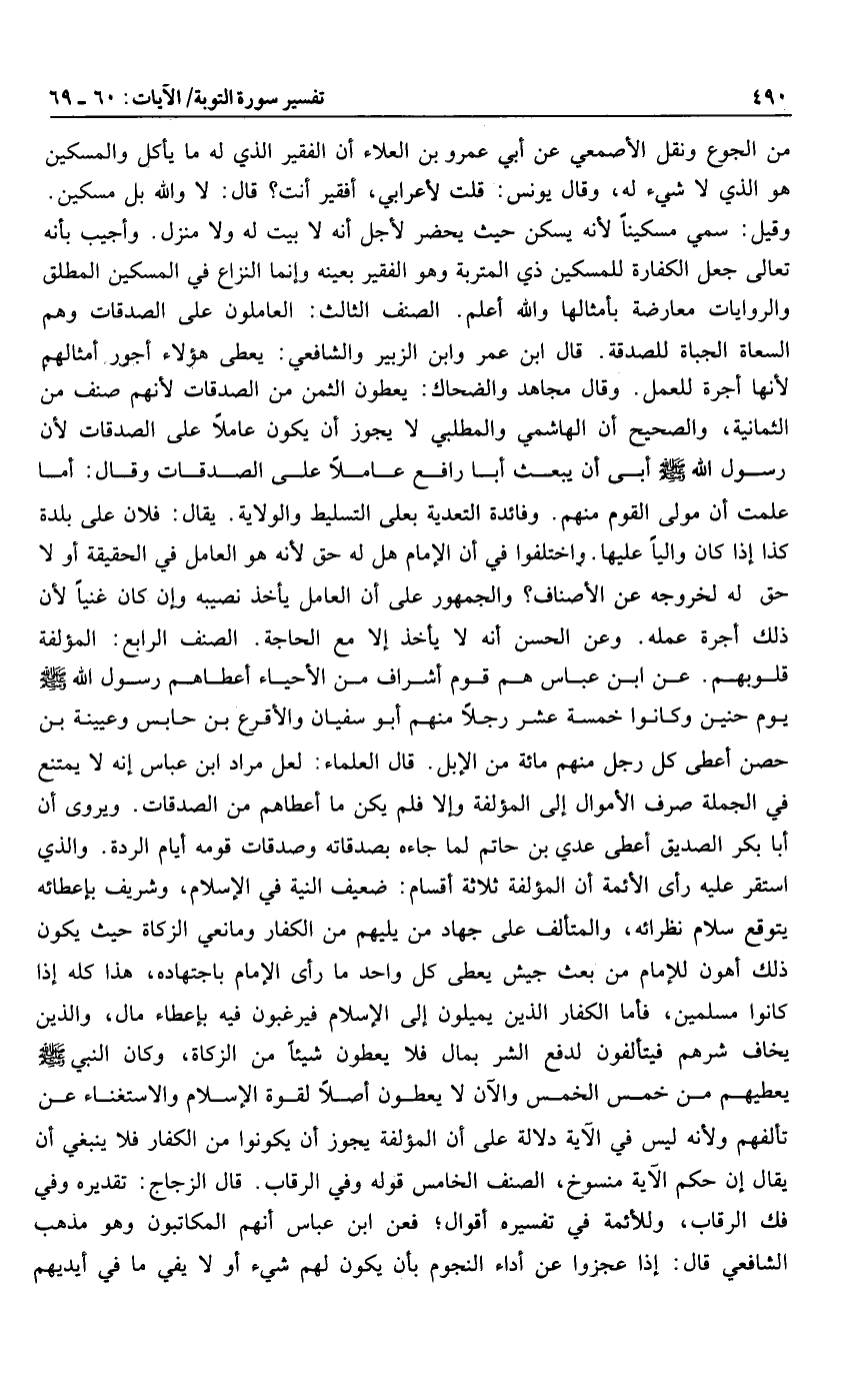 قال العلماء: لعل مراد ابن عباس إنه لا يمتنع في الجملة صرف الأموال إلى المؤلفة وإلا فلم يكن ما أعطاهم من الصدقات. ويروى أن أبا بكر الصديق أعطى عدي بن حاتم لما جاءه بصدقاته وصدقات قومه أيام الردة. والذي استقر عليه رأى الأئمة أن المؤلفة ثلاثة أقسام: ضعيف النية في الإسلام، وشريف بإعطائه يتوقع سلام نظرائه، والمتألف على جهاد من يليهم من الكفار ومانعي الزكاة حيث يكون ذلك أهون للإمام من بعث جيش يعطى كل واحد ما رأى الإمام باجتهاده، هذا كله إذا كانوا مسلمين، فأما الكفار الذين يميلون إلى الإسلام فيرغبون فيه بإعطاء مال، والذين يخاف شرهم فيتألفون لدفع الشر بمال فلا يعطون شيئا من الزكاة، وكان النبي صلى الله عليه وسلم يعطيهم من خمس الخمس والآن لا يعطون أصلا لقوة الإسلام والاستغناء عن تألفهم ولأنه ليس في الآية دلالة على أن المؤلفة يجوز أن يكونوا من الكفار فلا ينبغي أن يقال إن حكم الآية منسوخ، الصنف الخامس قوله وفي الرقاب. قال الزجاج: تقديره وفي فك الرقاب، وللأئمة في تفسيره أقوال فعن ابن عباس أنهم المكاتبون وهو مذهب الشافعي قال: إذا عجزوا عن أداء النجوم بأن يكون لهم شيء أو لا يفي ما في أيديهم