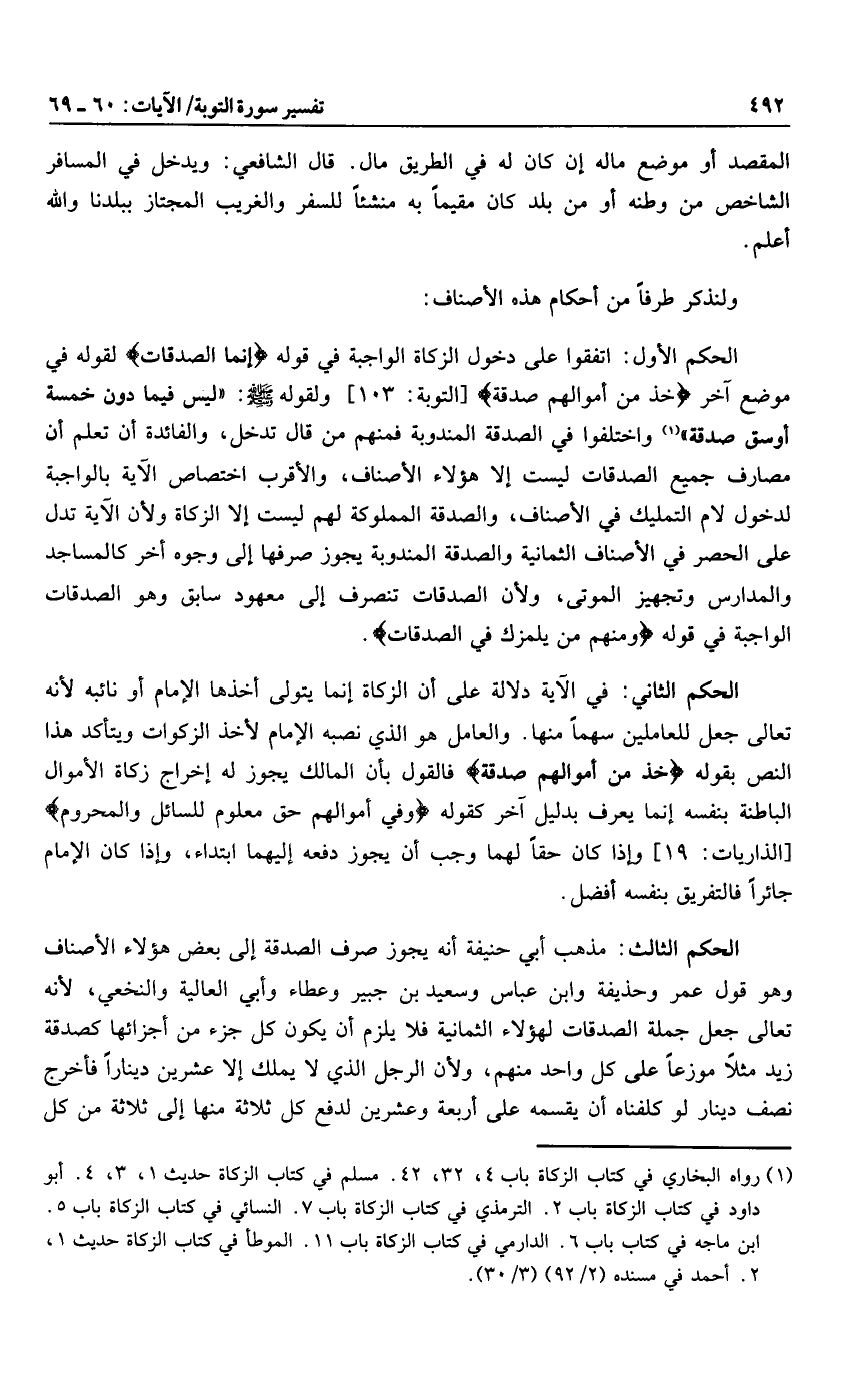 الحكم الثالث: مذهب أبي حنيفة أنه يجوز صرف الصدقة إلى بعض هؤلاء الأصناف وهو قول عمر وحذيفة وابن عباس وسعيد بن جبير وعطاء وأبي العالية والنخعي، لأنه تعالى جعل جملة الصدقات لهؤلاء الثمانية فلا يلزم أن يكون كل جزء من أجزائها كصدقة زيد مثلا موزعا على كل واحد منهم، ولأن الرجل الذي لا يملك إلا عشرين دينارا فأخرج نصف دينار لو كلفناه أن يقسمه على أربعة وعشرين لدفع كل ثلاثة منها إلى ثلاثة من كل