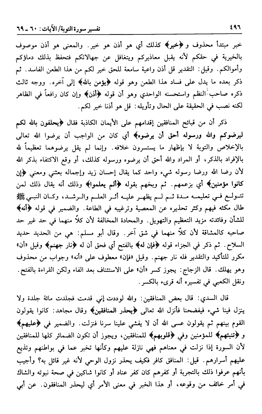 ذكر أن من قبائح المنافقين إقدامهم على الإيمان الكاذبة فقال يَحْلِفُونَ بِاللَّهِ لَكُمْ لِيُرْضُوكُمْ وَاللَّهُ وَرَسُولُهُ أَحَقُّ أَنْ يُرْضُوهُ أي كان من الواجب أن يرضوا الله تعالى بالإخلاص والتوبة لا بإظهار ما يستسرون خلافه. وإنما لم يقل يرضوهما تعظيما لله بالإفراد بالذكر، أو المراد والله أحق أن يرضوه ورسوله كذلك، أو وقع الاكتفاء بذكر الله لأن رضا الله ورضا رسوله شيء واحد كما يقال إحسان زيد وإجماله بعثني ومعني إِنْ كانُوا مُؤْمِنِينَ أي بزعمهم. ثم وبخهم بقوله أَلَمْ يَعْلَمُوا وذلك أنه يقال ذلك لمن تتولع في تعليمه مدة ثم لم يظهر عليه أثر العلم والرشد، وكان النبي صلى الله عليه وسلم طال مكثه فيهم وكثر تحذيره عن المعصية وترغيبه في الطاعة. والضمير في قوله أَنَّهُ للشأن وفائدته مزيد التعظيم والتهويل. والمحادة المخالفة لأن كلا منهما في حد غير حد صاحبه كالمشاقة لأن كلا منهما في شق آخر. وقال أبو مسلم: هي من الحديد حديد السلاح. ثم ذكر في الجزاء قوله فَأَنَّ لَهُ بالفتح أي فحق أن له نارَ جَهَنَّمَ وقيل «أن» مكرر للتأكيد والتقدير فله نار جهنم. وقيل «فإن» معطوف على «أنه» وجواب من محذوف وهو يهلك. قال الزجاج: يجوز كسر «أن» على الاستئناف بعد الفاء ولكن القراءة بالفتح.