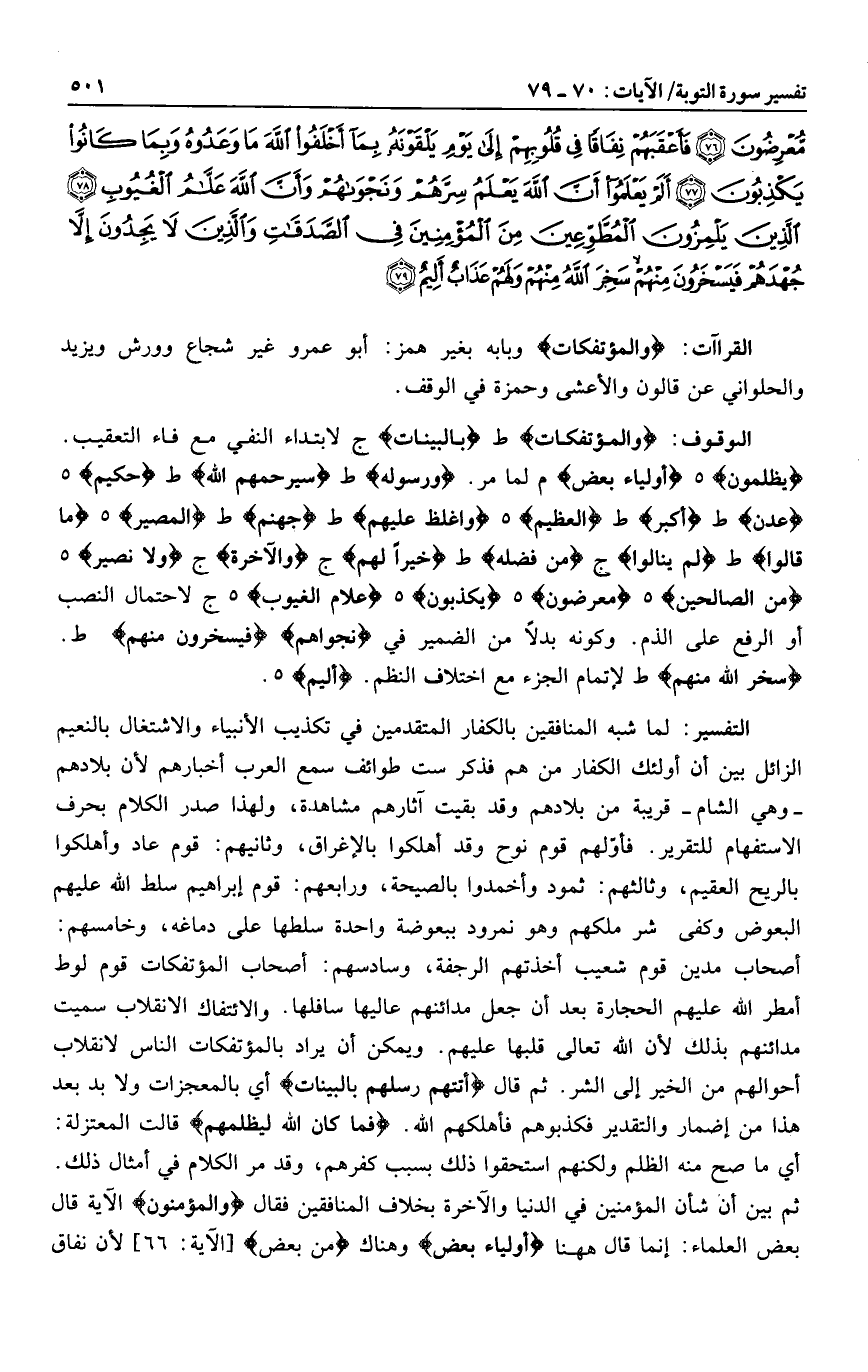 يَظْلِمُونَ هـ أَوْلِياءُ بَعْضٍ م لما مر. وَرَسُولَهُ ط سَيَرْحَمُهُمُ اللَّهُ ط حَكِيمٌ هـ عَدْنٍ ط أَكْبَرُ ط الْعَظِيمُ هـ وَاغْلُظْ عَلَيْهِمْ ط جَهَنَّمُ ط الْمَصِيرُ هـ ما قالُوا ط لَمْ يَنالُوا ج مِنْ فَضْلِهِ ط خَيْراً لَهُمْ ج وَالْآخِرَةِ ج وَلا نَصِيرٍ هـ مِنَ الصَّالِحِينَ هـ مُعْرِضُونَ هـ يَكْذِبُونَ هـ عَلَّامُ الْغُيُوبِ هـ ج لاحتمال النصب أو الرفع على الذم. وكونه بدلا من الضمير في نَجْواهُمْ فَيَسْخَرُونَ مِنْهُمْ ط.