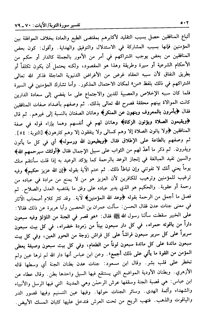 أتباع المنافقين حصل بسبب التقليد لأكابرهم بمقتضى الطبع والعادة بخلاف الموافقة بين المؤمنين فإنها بسبب المشاركة في الاستدلال والتوفيق والهداية. وأقول: كون بعض المنافقين من بعض يوجب اشتراكهم في أمر من الأمور بالجملة كالدار أو حكم من الأحكام الشرعية أو سيرة وطريقة وهذا هو المقصود، ولكنه يحتمل أن يكون تكلفا أو بطريق النفاق لأن سببه انعقاد غرض من الأغراض الدنيوية العاجلة فذكر الله تعالى اشتراكهم في ذلك بلفظ «من» لمكان الاحتمال المذكور. وأما تشارك المؤمنين في السيرة فلما كان سببه الإخلاص والعصبية للدين والاجتماع على ما يفضي إلى سعادة الدارين كانت الموالاة بينهم محققة فصرح الله تعالى بذلك. ثم وصفهم بأضداد صفات المنافقين فقال يَأْمُرُونَ بِالْمَعْرُوفِ وَيَنْهَوْنَ عَنِ الْمُنْكَرِ وهاتان الصفتان بالنسبة إلى غيرهم. ثم قال وَيُقِيمُونَ الصَّلاةَ وَيُؤْتُونَ الزَّكاةَ وهاتان لهم في أنفسهم وهما بإزاء قوله في صفة المنافقين وَلا يَأْتُونَ الصَّلاةَ إِلَّا وَهُمْ كُسالى وَلا يُنْفِقُونَ إِلَّا وَهُمْ كارِهُونَ [التوبة: 54] .