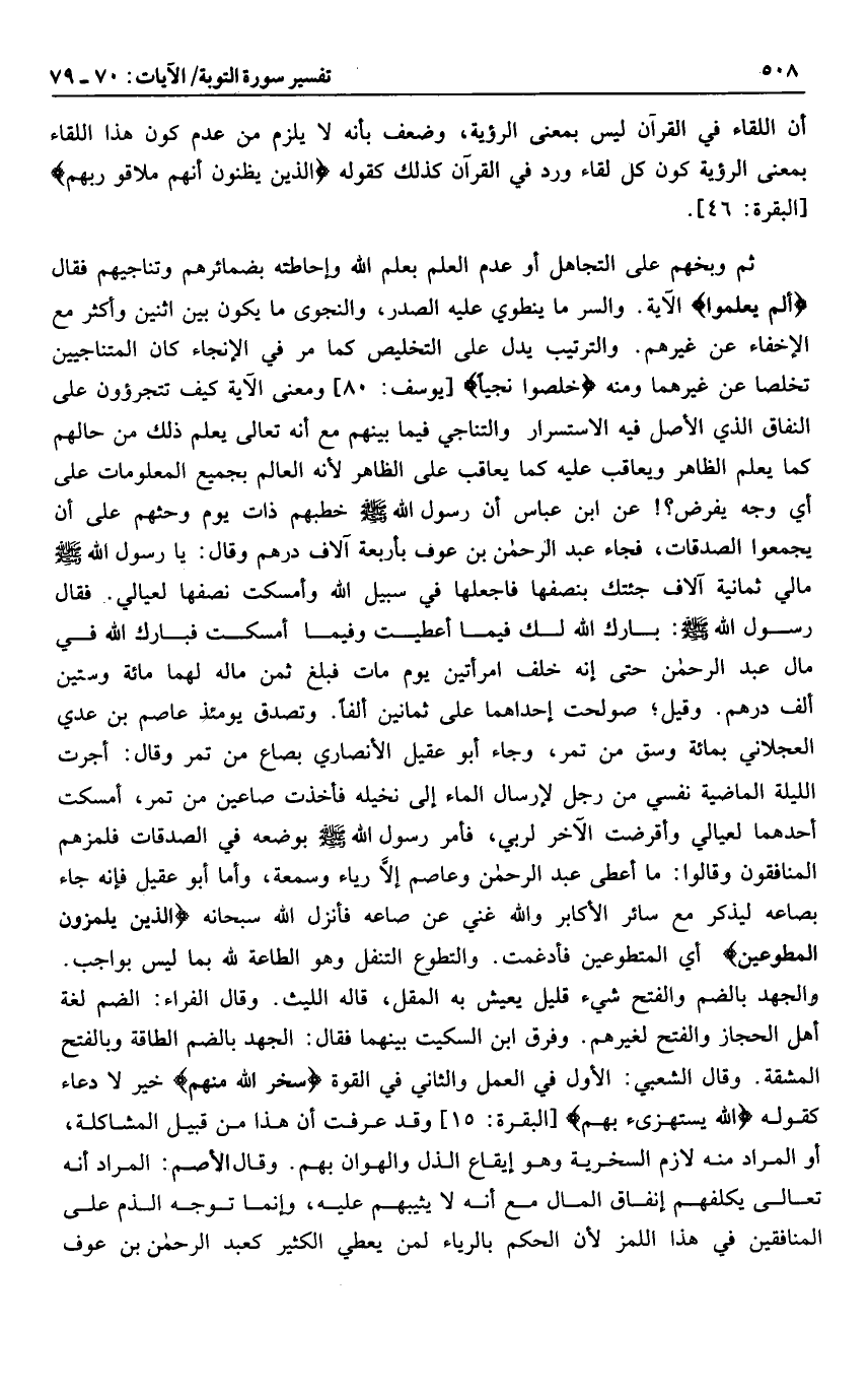 عن ابن عباس أن رسول الله صلى الله عليه وسلم خطبهم ذات يوم وحثهم على أن يجمعوا الصدقات، فجاء عبد الرحمن بن عوف بأربعة آلاف درهم وقال: يا رسول الله صلى الله عليه وسلم مالي ثمانية آلاف جئتك بنصفها فاجعلها في سبيل الله وأمسكت نصفها لعيالي. فقال رسول الله صلى الله عليه وسلم: بارك الله لك فيما أعطيت وفيما أمسكت فبارك الله في مال عبد الرحمن حتى إنه خلف امرأتين يوم مات فبلغ ثمن ماله لهما مائة وستين ألف درهم. وقيل صولحت إحداهما على ثمانين ألفا. وتصدق يومئذ عاصم بن عدي العجلاني بمائة وسق من تمر، وجاء أبو عقيل الأنصاري بصاع من تمر وقال: أجرت الليلة الماضية نفسي من رجل لإرسال الماء إلى نخيله فأخذت صاعين من تمر، أمسكت أحدهما لعيالي وأقرضت الآخر لربي، فأمر رسول الله صلى الله عليه وسلم بوضعه في الصدقات فلمزهم المنافقون وقالوا: ما أعطى عبد الرحمن وعاصم إلّا رياء وسمعة، وأما أبو عقيل فإنه جاء بصاعه ليذكر مع سائر الأكابر والله غني عن صاعه فأنزل الله سبحانه الَّذِينَ يَلْمِزُونَ الْمُطَّوِّعِينَ