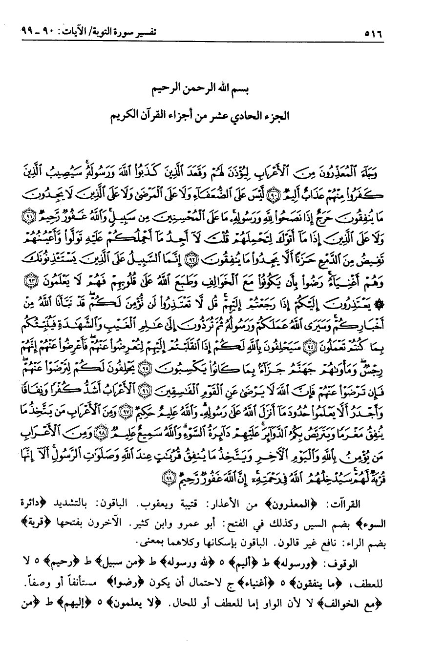 وَجاءَ الْمُعَذِّرُونَ مِنَ الْأَعْرابِ لِيُؤْذَنَ لَهُمْ وَقَعَدَ الَّذِينَ كَذَبُوا اللَّهَ وَرَسُولَهُ سَيُصِيبُ الَّذِينَ كَفَرُوا مِنْهُمْ عَذابٌ أَلِيمٌ (90) لَيْسَ عَلَى الضُّعَفاءِ وَلا عَلَى الْمَرْضى وَلا عَلَى الَّذِينَ لا يَجِدُونَ ما يُنْفِقُونَ حَرَجٌ إِذا نَصَحُوا لِلَّهِ وَرَسُولِهِ ما عَلَى الْمُحْسِنِينَ مِنْ سَبِيلٍ وَاللَّهُ غَفُورٌ رَحِيمٌ (91) وَلا عَلَى الَّذِينَ إِذا ما أَتَوْكَ لِتَحْمِلَهُمْ قُلْتَ لا أَجِدُ ما أَحْمِلُكُمْ عَلَيْهِ تَوَلَّوْا وَأَعْيُنُهُمْ تَفِيضُ مِنَ الدَّمْعِ حَزَناً أَلاَّ يَجِدُوا ما يُنْفِقُونَ (92) إِنَّمَا السَّبِيلُ عَلَى الَّذِينَ يَسْتَأْذِنُونَكَ وَهُمْ أَغْنِياءُ رَضُوا بِأَنْ يَكُونُوا مَعَ الْخَوالِفِ وَطَبَعَ اللَّهُ عَلى قُلُوبِهِمْ فَهُمْ لا يَعْلَمُونَ (93) يَعْتَذِرُونَ إِلَيْكُمْ إِذا رَجَعْتُمْ إِلَيْهِمْ قُلْ لا تَعْتَذِرُوا لَنْ نُؤْمِنَ لَكُمْ قَدْ نَبَّأَنَا اللَّهُ مِنْ أَخْبارِكُمْ وَسَيَرَى اللَّهُ عَمَلَكُمْ وَرَسُولُهُ ثُمَّ تُرَدُّونَ إِلى عالِمِ الْغَيْبِ وَالشَّهادَةِ فَيُنَبِّئُكُمْ بِما كُنْتُمْ تَعْمَلُونَ (94)