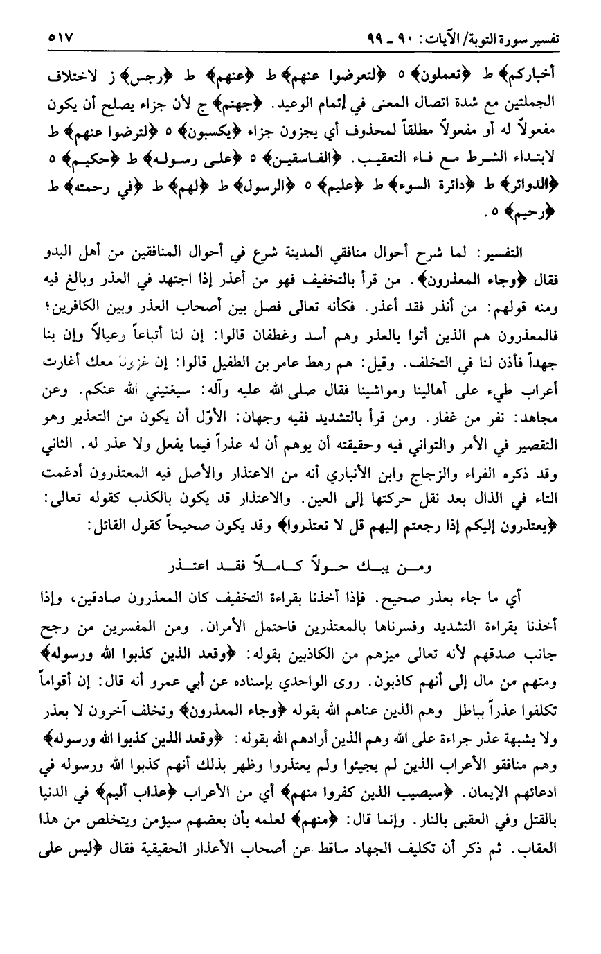 ومن يبك حولا كاملا فقد اعتذر أي ما جاء بعذر صحيح. فإذا أخذنا بقراءة التخفيف كان المعذرون صادقين، وإذا أخذنا بقراءة التشديد وفسرناها بالمعتذرين فاحتمل الأمران. ومن المفسرين من رجح جانب صدقهم لأنه تعالى ميزهم من الكاذبين بقوله: وَقَعَدَ الَّذِينَ كَذَبُوا اللَّهَ وَرَسُولَهُ ومنهم من مال إلى أنهم كاذبون. روى الواحدي بإسناده عن أبي عمرو أنه قال: إن أقواما تكلفوا عذرا بباطل وهم الذين عناهم الله بقوله وَجاءَ الْمُعَذِّرُونَ وتخلف آخرون لا بعذر ولا بشبهة عذر جراءة على الله وهم الذين أرادهم الله بقوله: وَقَعَدَ الَّذِينَ كَذَبُوا اللَّهَ وَرَسُولَهُ وهم منافقو الأعراب الذين لم يجيئوا ولم يعتذروا وظهر بذلك أنهم كذبوا الله ورسوله في ادعائهم الإيمان. سَيُصِيبُ الَّذِينَ كَفَرُوا مِنْهُمْ أي من الأعراب عَذابٌ أَلِيمٌ في الدنيا بالقتل وفي العقبى بالنار. وإنما قال: مِنْهُمْ لعلمه بأن بعضهم سيؤمن ويتخلص من هذا العقاب. ثم ذكر أن تكليف الجهاد ساقط عن أصحاب الأعذار الحقيقية فقال لَيْسَ عَلَى