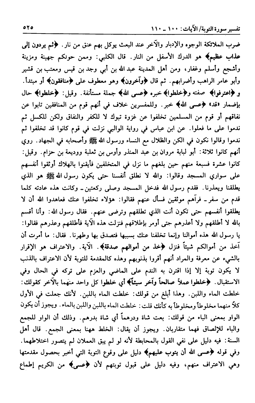 واعْتَرَفُوا صفته وخَلَطُوا خبره عَسَى اللَّهُ جملة مستأنفة. وقيل: خَلَطُوا حال بإضمار «قد» عَسَى اللَّهُ خبر. وللمفسرين خلاف في أنهم قوم من المنافقين تابوا عن نفاقهم أو قوم من المسلمين تخلفوا عن غزوة تبوك لا للكفر والنفاق ولكن للكسل ثم ندموا على ما فعلوا. عن ابن عباس في رواية الوالبي نزلت في قوم كانوا قد تخلفوا ثم ندموا وقالوا نكون في الكن والظلال مع النساء ورسول الله صلى الله عليه وسلم وأصحابه في الجهاد. روي أنهم كانوا ثلاثة: أبو لبابة مروان بن عبد المنذر وأوس بن ثعلبة ووديعة بن حزام.