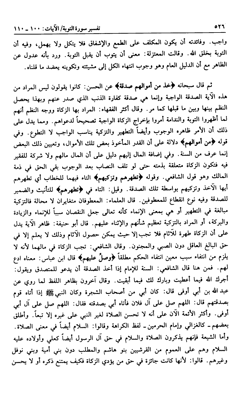 ثم قال سبحانه خُذْ مِنْ أَمْوالِهِمْ صَدَقَةً عن الحسن: كانوا يقولون ليس المراد من هذه الآية الصدقة الواجبة وإنما هي صدقة كفارة الذنب الذي صدر عنهم وبهذا يحصل النظم بينها وبين ما قبلها كما مر. وقال أكثر الفقهاء: المراد بها الزكاة ووجه النظم أنهم لما أظهروا التوبة والندامة أمروا بإخراج الزكاة الواجبة تصحيحا لدعواهم. ومما يدل على ذلك أن الأمر ظاهره الوجوب وأيضا التطهير والتزكية يناسب الواجب لا التطوع. وفي قوله مِنْ أَمْوالِهِمْ دلالة على أن القدر المأخوذ بعض تلك الأموال، وتعيين ذلك البعض إنما عرف من السنة. وفي إضافة المال إليهم دليل على أن المال مالهم ولا شركة للفقير فيه فتكون الزكاة متعلقة بذمته حتى لو تلف النصاب بعد الوجوب بقي الحق في ذمة المالك وهو قول الشافعي. وقوله تُطَهِّرُهُمْ وَتُزَكِّيهِمْ التاء فيهما للخطاب أي تطهرهم أيها الآخذ وتزكيهم بواسطة تلك الصدقة. وقيل: التاء في تُطَهِّرُهُمْ للتأنيث والضمير للصدقة وفيه نوع انقطاع للمعطوفين. قال العلماء: المعطوفان متغايران لا محالة فالتزكية مبالغة في التطهير أو هي بمعنى الإنماء كأنه تعالى جعل النقصان سببا للإنماء والزيادة والبركة، أو المراد بالتزكية تعظيم شأنهم والإثناء عليهم. قال أبو حنيفة: ظاهر الآية يدل على أن الزكاة طهرة للآثام فلا تجب إلا حيث يمكن حصول الآثام وذلك لا يعلم إلا في حق البالغ العاقل دون الصبي والمجنون. وقال الشافعي: تجب الزكاة في مالهما لأنه لا يلزم من انتفاء سبب معين انتفاء الحكم مطلقا وَصَلِّ عَلَيْهِمْ قال ابن عباس: معناه ادع لهم. فمن هنا قال الشافعي: السنة للإمام إذا أخذ الصدقة أن يدعو للمتصدق ويقول:
