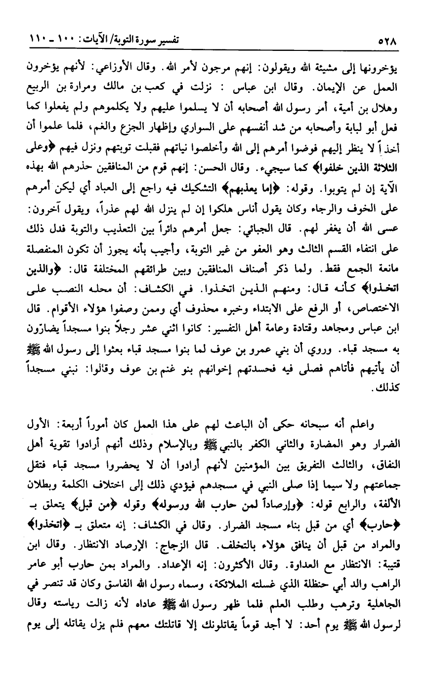 واعلم أنه سبحانه حكى أن الباعث لهم على هذا العمل كان أمورا أربعة: الأول الضرار وهو المضارة والثاني الكفر بالنبي صلى الله عليه وسلم وبالإسلام وذلك أنهم أرادوا تقوية أهل النفاق، والثالث التفريق بين المؤمنين لأنهم أرادوا أن لا يحضروا مسجد قباء فتقل جماعتهم ولا سيما إذا صلى النبي في مسجدهم فيؤدي ذلك إلى اختلاف الكلمة وبطلان الألفة، والرابع قوله: وَإِرْصاداً لِمَنْ حارَبَ اللَّهَ وَرَسُولَهُ وقوله مِنْ قَبْلُ يتعلق ب حارَبَ أي من قبل بناء مسجد الضرار. وقال في الكشاف: إنه متعلق ب اتَّخَذُوا والمراد من قبل أن ينافق هؤلاء بالتخلف. قال الزجاج: الإرصاد الانتظار. وقال ابن قتيبة: الانتظار مع العداوة.