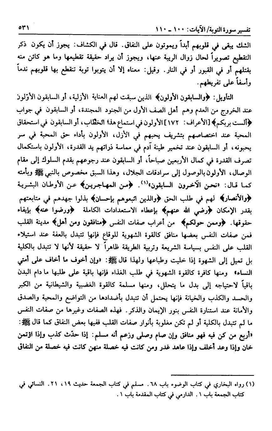 مِنَ الْمُهاجِرِينَ عن الأوطان البشرية وَالْأَنْصارِ لهم في طلب الحق وَالَّذِينَ اتَّبَعُوهُمْ بِإِحْسانٍ بذلوا جهدهم في متابعتهم بقدر الإمكان رَضِيَ اللَّهُ عَنْهُمْ بإعطاء الاستعدادات الكاملة وَرَضُوا عَنْهُ بإيفاء حقوقها. وَمِمَّنْ حَوْلَكُمْ من أعراب صفات النفس مُنافِقُونَ وَمِنْ أَهْلِ مدينة القلب فمن صفات النفس بعضها منافق كالقوة الشهوية للوقاع فإنها تتبدل بالعفة عند استيلاء القلب على النفس بسياسة الشريعة وتربية الطريقة ظاهرا لا حقيقة لأنها لا تتبدل بالكلية بل تميل إلى الشهوة إذا خليت وطباعها ولهذا