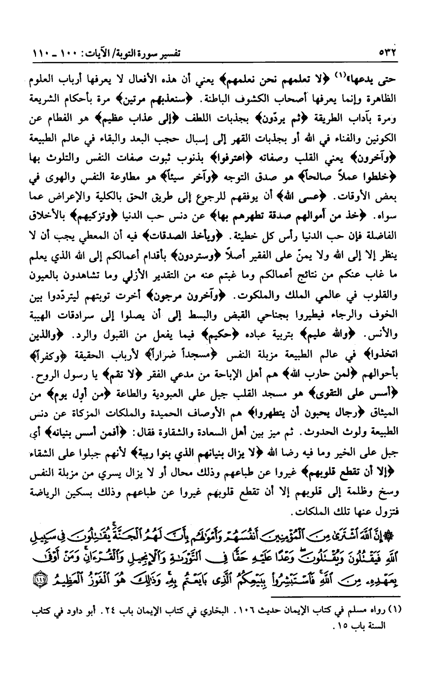 لا تَعْلَمُهُمْ نَحْنُ نَعْلَمُهُمْ يعني أن هذه الأفعال لا يعرفها أرباب العلوم الظاهرة وإنما يعرفها أصحاب الكشوف الباطنة. سَنُعَذِّبُهُمْ مَرَّتَيْنِ مرة بأحكام الشريعة ومرة بآداب الطريقة ثُمَّ يُرَدُّونَ بجذبات اللطف إِلى عَذابٍ عَظِيمٍ هو الفطام عن الكونين والفناء في الله أو بجذبات القهر إلى إسبال حجب البعد والبقاء في عالم الطبيعة وَآخَرُونَ يعني القلب وصفاته اعْتَرَفُوا بذنوب ثبوت صفات النفس والتلوث بها خَلَطُوا عَمَلًا صالِحاً هو صدق التوجه وَآخَرَ سَيِّئاً هو مطاوعة النفس والهوى في بعض الأوقات. عَسَى اللَّهُ أن يوفقهم للرجوع إلى طريق الحق بالكلية والإعراض عما سواه. خُذْ مِنْ أَمْوالِهِمْ صَدَقَةً تُطَهِّرُهُمْ وَتُزَكِّيهِمْ بِها عن دنس حب الدنيا وَتُزَكِّيهِمْ بالأخلاق الفاضلة فإن حب الدنيا رأس كل خطيئة. وَيَأْخُذُ الصَّدَقاتِ فيه أن المعطي يجب أن لا ينظر إلا إلى الله ولا يمنّ على الفقير أصلا وَسَتُرَدُّونَ بأقدام أعمالكم إلى الله الذي يعلم ما غاب عنكم من نتائج أعمالكم وما غبتم عنه من التقدير الأزلي وما تشاهدون بالعيون والقلوب في عالمي الملك والملكوت. وَآخَرُونَ مُرْجَوْنَ أخرت توبتهم ليتردّدوا بين الخوف والرجاء فيطيروا بجناحي القبض والبسط إلى أن يصلوا إلى سرادقات الهيبة والأنس. وَاللَّهُ عَلِيمٌ بتربية عباده حَكِيمٌ فيما يفعل من القبول والرد. وَالَّذِينَ اتَّخَذُوا في عالم الطبيعة مزبلة النفس مَسْجِداً ضِراراً لأرباب الحقيقة وَكُفْراً بأحوالهم لِمَنْ حارَبَ اللَّهَ هم أهل الإباحة من مدعي الفقر لا تَقُمْ يا رسول الروح.