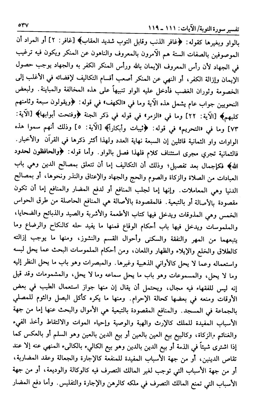 فالثمانية تجري مجرى استئناف كلام فلهذا فصل بالواو. وأما قوله: وَالْحافِظُونَ لِحُدُودِ اللَّهِ فكإجمال بعد تفصيل وذلك أن التكاليف إما أن تتعلق بمصالح الدين وهي باب العبادات من الصلاة والزكاة والصوم والحج والجهاد والإعتاق والنذر ونحوها، أو بمصالح الدنيا وهي المعاملات. وإنها إما لجلب المنافع أو لدفع المضار والمنافع إما أن تكون مقصودة بالأصالة أو بالتبعية. فالمقصودة بالأصالة هي المنافع الحاصلة من طرق الحواس الخمس وهي المذوقات ويدخل فيها كتاب الأطعمة والأشربة والصيد والذبائح والضحايا، والملموسات ويدخل فيها باب أحكام الوقاع فمنها ما يفيد حله كالنكاح والرضاع وما يتبعهما من المهر والنفقة والسكنى وأحوال القسم والنشوز، ومنها ما يوجب إزالته كالطلاق والخلع والإيلاء والظهار واللعان، ومن أحكام الملموسات البحث عما يحل لبسه واستعماله وعما لا يحل كالأواني الذهبية وغيرها. والمبصرات وهو باب ما يحل النظر إليه وما لا يحل، والمسموعات وهو باب ما يحل سماعه وما لا يحل، والمشمومات وقد قيل إنه ليس للفقهاء فيه مجال، ويحتمل أن يقال إن منها جواز استعمال الطيب في بعض الأوقات ومنعه في بعضها كحالة الإحرام. ومنها ما يكره كأكل البصل والثوم للمصلي بالجماعة في المسجد. والمنافع المقصودة بالتبعية هي الأموال والبحث عنها إما من جهة الأسباب المفيدة للملك كالإرث والهبة والوصية وإحياء الموات والالتقاط وأخذ الفيء والغنائم والزكاة، وكالبيع بين العين بالعين أو بيع الدين بالعين وهو السلم أو بالعكس كما إذا اشترى شيئا في الذمة أو بيع الدين بالدين وهو بيع الكالئ بالكالئ المنهي عنه إلا عند تقاص الدينين، أو من جهة الأسباب المفيدة للمنفعة كالإجارة والجعالة وعقد المضاربة، أو من جهة الأسباب التي توجب لغير المالك التصرف فيه كالوكالة والوديعة، أو من جهة الأسباب التي تمنع المالك التصرف في ملكه كالرهن والإجارة والتفليس. وأما دفع المضار