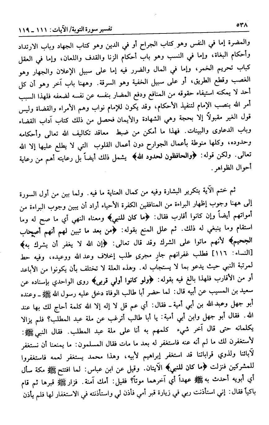 ثم ختم الآية بتكرير البشارة وفيه من كمال العناية ما فيه. ولما بين من أول السورة إلى هاهنا وجوب إظهار البراءة من المنافقين الكفرة الأحياء أراد أن يبين وجوب البراءة من أمواتهم أيضا وإن كانوا أقارب فقال: ما كانَ لِلنَّبِيِّ ومعناه النهي أي ما صح له وما استقام وما ينبغي له ذلك. ثم علل المنع بقوله: مِنْ بَعْدِ ما تَبَيَّنَ لَهُمْ أَنَّهُمْ أَصْحابُ الْجَحِيمِ لأنهم ماتوا على الشرك وقد قال تعالى: إِنَّ اللَّهَ لا يَغْفِرُ أَنْ يُشْرَكَ بِهِ [النساء: 116] فطلب غفرانهم جار مجرى طلب إخلاف وعد الله ووعيده، وفيه حط لمرتبة النبي حيث يدعو بما لا يستجاب له. وهذه العلة لا تختلف بأن يكونوا من الأباعد أو من الأقارب فلهذا بالغ فيه بقوله: وَلَوْ كانُوا أُولِي قُرْبى