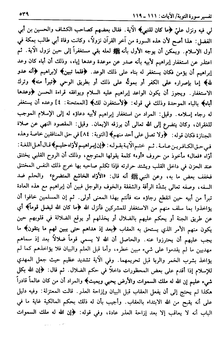 فقال بعضهم كصاحب الكشاف والحسين بن أبي الفضل: هذا أصح لأن هذه السورة من آخر القرآن نزولا، وكانت وفاة أبي طالب بمكة في أول الإسلام. ويمكن أن يوجه الأول بأنه صلى الله عليه وسلم لعله بقي مستغفرا إلى حين نزول الآية. ثم اعتذر عن استغفار إبراهيم لأبيه بأنه صدر عن موعدة وعدها إياه، وذلك أن أباه كان وعد إبراهيم أن يؤمن فكان يستغفر له بناء على ذلك الوعد. فَلَمَّا تَبَيَّنَ لإبراهيم أَنَّهُ عَدُوٌّ لِلَّهِ إما بإصراره على الكفر أو بموته على ذلك أو بطريق الوحي تَبَرَّأَ مِنْهُ وترك الاستغفار. ويجوز أن يكون الواعد إبراهيم عليه السلام ويوافقه قراءة الحسن وعدها أباه بالباء الموحدة وذلك في قوله: لَأَسْتَغْفِرَنَّ لَكَ [الممتحنة: 4] وعده أن يستغفر له رجاء إسلامه. وقيل: المراد من استغفار إبراهيم لأبيه دعاؤه له إلى الإسلام الموجب للغفران، وكان يتضرع إلى الله تعالى أن يرزقه الإيمان. وقيل: المقصود النهي عن صلاة الجنازة فكان قوله: وَلا تُصَلِّ عَلى أَحَدٍ مِنْهُمْ [التوبة: 84] في حق المنافقين خاصة وهذه في حق الكافرين عامة. ثم ختم الآية بقوله: إِنَّ إِبْراهِيمَ لَأَوَّاهٌ حَلِيمٌ قال أهل اللغة: