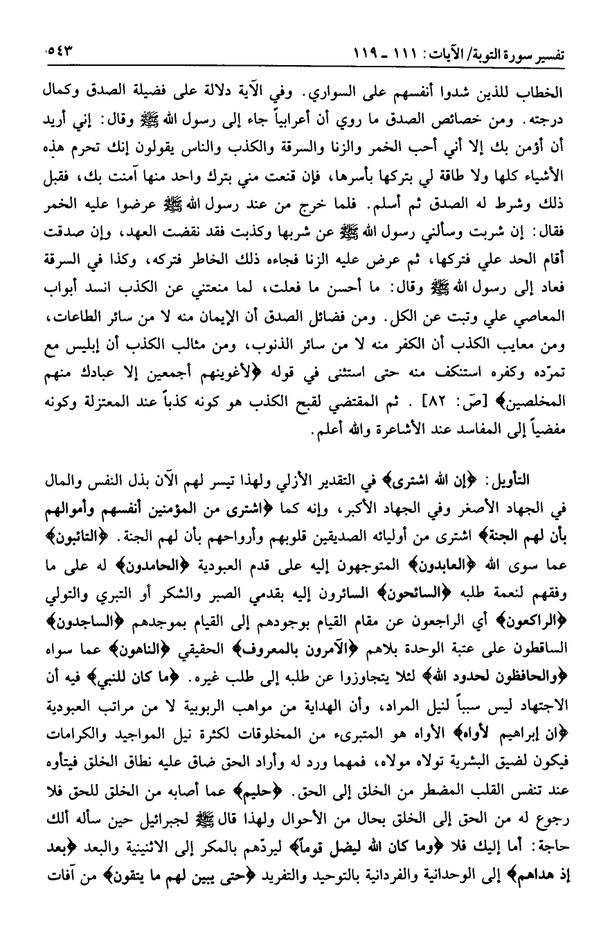 إِنَّ اللَّهَ اشْتَرى في التقدير الأزلي ولهذا تيسر لهم الآن بذل النفس والمال في الجهاد الأصغر وفي الجهاد الأكبر، وإنه كما اشْتَرى مِنَ الْمُؤْمِنِينَ أَنْفُسَهُمْ وَأَمْوالَهُمْ بِأَنَّ لَهُمُ الْجَنَّةَ اشترى من أوليائه الصديقين قلوبهم وأرواحهم بأن لهم الجنة. التَّائِبُونَ عما سوى الله الْعابِدُونَ المتوجهون إليه على قدم العبودية الْحامِدُونَ له على ما وفقهم لنعمة طلبه السَّائِحُونَ السائرون إليه بقدمي الصبر والشكر أو التبري والتولي الرَّاكِعُونَ أي الراجعون عن مقام القيام بوجودهم إلى القيام بموجدهم السَّاجِدُونَ الساقطون على عتبة الوحدة بلاهم الْآمِرُونَ بِالْمَعْرُوفِ الحقيقي النَّاهُونَ عما سواه وَالْحافِظُونَ لِحُدُودِ اللَّهِ لئلا يتجاوزوا عن طلبه إلى طلب غيره. ما كانَ لِلنَّبِيِّ فيه أن الاجتهاد ليس سببا لنيل المراد، وأن الهداية من مواهب الربوبية لا من مراتب العبودية إِنَّ إِبْراهِيمَ لَأَوَّاهٌ الأواه هو المتبرئ من المخلوقات لكثرة نيل المواجيد والكرامات فيكون لضيق البشرية تولاه مولاه، فمهما ورد له وأراد الحق ضاق عليه نطاق الخلق فيتأوه عند تنفس القلب المضطر من الخلق إلى الحق. حَلِيمٌ عما أصابه من الخلق للحق فلا رجوع له من الحق إلى الخلق بحال من الأحوال ولهذا