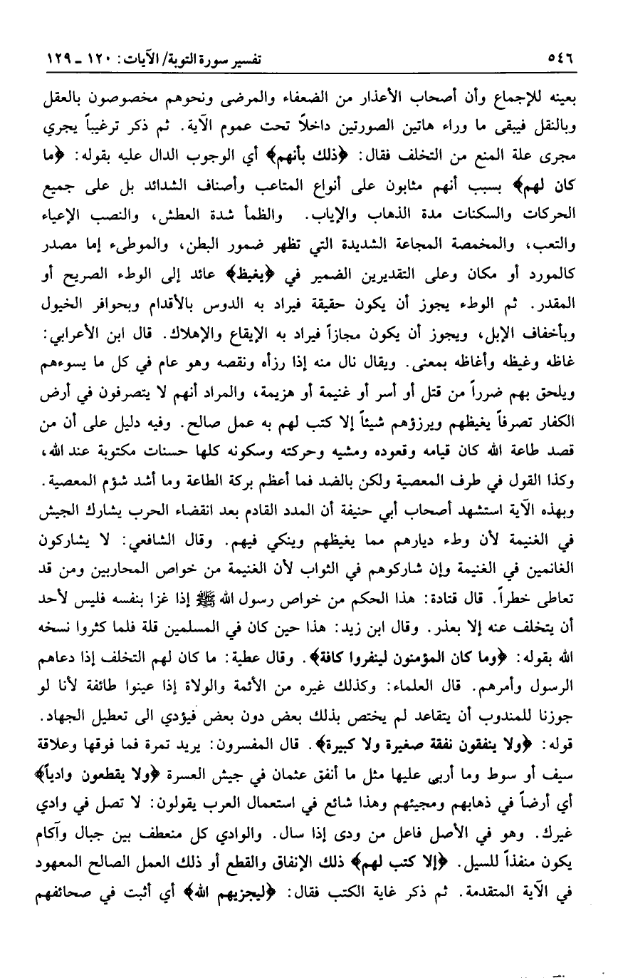 بعينه للإجماع وأن أصحاب الأعذار من الضعفاء والمرضى ونحوهم مخصوصون بالعقل وبالنقل فيبقى ما وراء هاتين الصورتين داخلا تحت عموم الآية. ثم ذكر ترغيبا يجري مجرى علة المنع من التخلف فقال: ذلِكَ بِأَنَّهُمْ أي الوجوب الدال عليه بقوله: ما كانَ لِأَهْلِ الْمَدِينَةِ بسبب أنهم مثابون على أنواع المتاعب وأصناف الشدائد بل على جميع الحركات والسكنات مدة الذهاب والإياب. والظمأ شدة العطش، والنصب الإعياء والتعب، والمخمصة المجاعة الشديدة التي تظهر ضمور البطن، والموطئ إما مصدر كالمورد أو مكان وعلى التقديرين الضمير في يَغِيظُ عائد إلى الوطء الصريح أو المقدر. ثم الوطء يجوز أن يكون حقيقة فيراد به الدوس بالأقدام وبحوافر الخيول وبأخفاف الإبل، ويجوز أن يكون مجازا فيراد به الإيقاع والإهلاك. قال ابن الأعرابي: