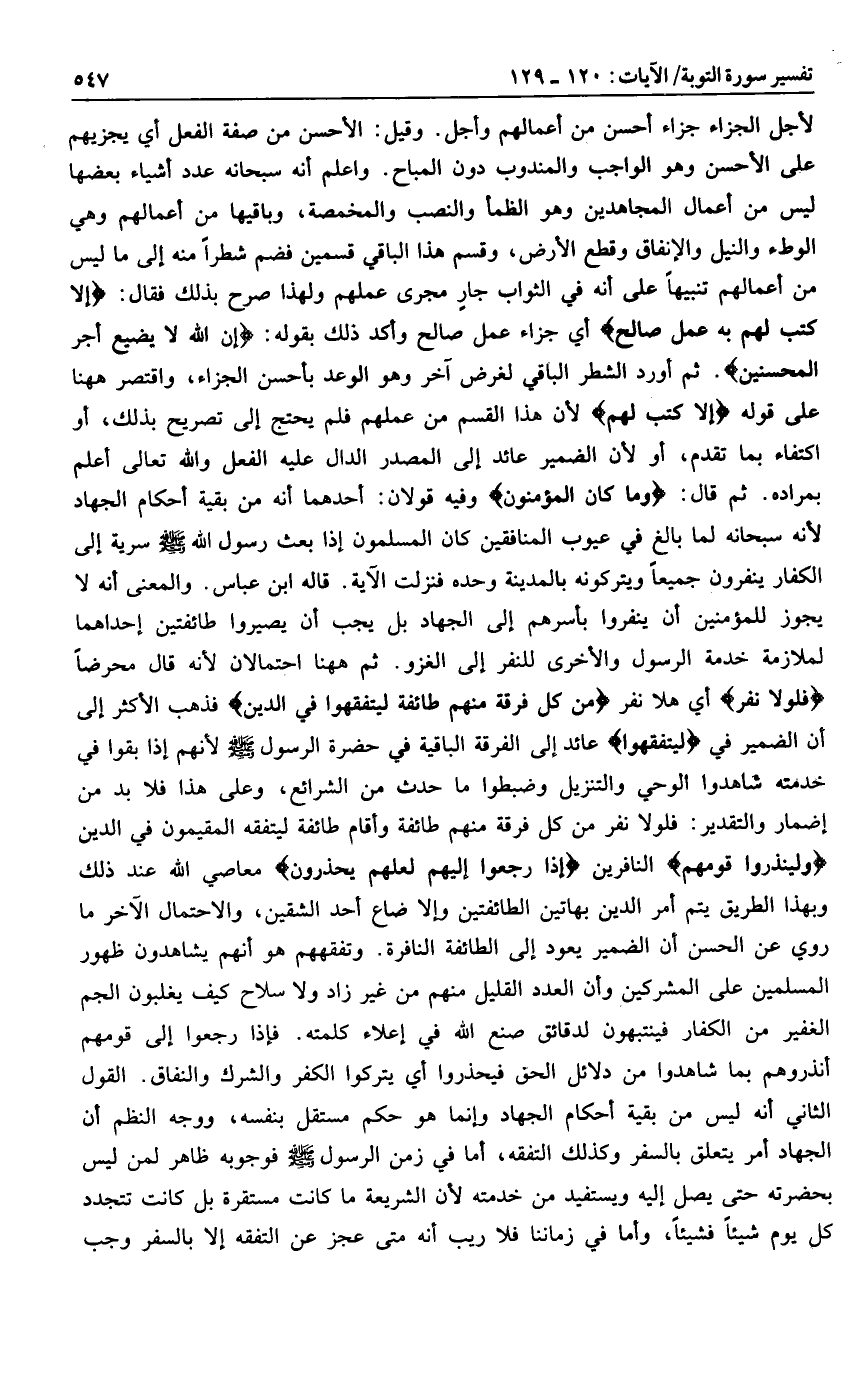 لأجل الجزاء جزاء أحسن من أعمالهم وأجل. وقيل: الأحسن من صفة الفعل أي يجزيهم على الأحسن وهو الواجب والمندوب دون المباح. واعلم أنه سبحانه عدد أشياء بعضها ليس من أعمال المجاهدين وهو الظمأ والنصب والمخمصة، وباقيها من أعمالهم وهي الوطء والنيل والإنفاق وقطع الأرض، وقسم هذا الباقي قسمين فضم شطرا منه إلى ما ليس من أعمالهم تنبيها على أنه في الثواب جار مجرى عملهم ولهذا صرح بذلك فقال: إِلَّا كُتِبَ لَهُمْ بِهِ عَمَلٌ صالِحٌ أي جزاء عمل صالح وأكد ذلك بقوله: إِنَّ اللَّهَ لا يُضِيعُ أَجْرَ الْمُحْسِنِينَ. ثم أورد الشطر الباقي لغرض آخر وهو الوعد بأحسن الجزاء، واقتصر هاهنا على قوله إِلَّا كُتِبَ لَهُمْ لأن هذا القسم من عملهم فلم يحتج إلى تصريح بذلك، أو اكتفاء بما تقدم، أو لأن الضمير عائد إلى المصدر الدال عليه الفعل والله تعالى أعلم بمراده. ثم قال: وَما كانَ الْمُؤْمِنُونَ وفيه قولان: أحدهما أنه من بقية أحكام الجهاد لأنه سبحانه لما بالغ في عيوب المنافقين كان المسلمون إذا بعث رسول الله صلى الله عليه وسلم سرية إلى الكفار ينفرون جميعا ويتركونه بالمدينة وحده فنزلت الآية. قاله ابن عباس. والمعنى أنه لا يجوز للمؤمنين أن ينفروا بأسرهم إلى الجهاد بل يجب أن يصيروا طائفتين إحداهما لملازمة خدمة الرسول والأخرى للنفر إلى الغزو. ثم هاهنا احتمالان لأنه قال محرضا فَلَوْلا نَفَرَ أي هلا نفر مِنْ كُلِّ فِرْقَةٍ مِنْهُمْ طائِفَةٌ لِيَتَفَقَّهُوا فِي الدِّينِ فذهب الأكثر إلى أن الضمير في لِيَتَفَقَّهُوا عائد إلى الفرقة الباقية في حضرة الرسول صلى الله عليه وسلم لأنهم إذا بقوا في خدمته شاهدوا الوحي والتنزيل وضبطوا ما حدث من الشرائع، وعلى هذا فلا بد من إضمار والتقدير: فلولا نفر من كل فرقة منهم طائفة وأقام طائفة ليتفقه المقيمون في الدين وَلِيُنْذِرُوا قَوْمَهُمْ النافرين إِذا رَجَعُوا إِلَيْهِمْ لَعَلَّهُمْ يَحْذَرُونَ معاصي الله عند ذلك وبهذا الطريق يتم أمر الدين بهاتين الطائفتين وإلا ضاع أحد الشقين، والاحتمال الآخر ما روي عن الحسن أن الضمير يعود إلى الطائفة النافرة. وتفقههم هو أنهم يشاهدون ظهور المسلمين على المشركين وأن العدد القليل منهم من غير زاد ولا سلاح كيف يغلبون الجم الغفير من الكفار فينتبهون لدقائق صنع الله في إعلاء كلمته. فإذا رجعوا إلى قومهم أنذروهم بما شاهدوا من دلائل الحق فيحذروا أي يتركوا الكفر والشرك والنفاق. القول الثاني أنه ليس من بقية أحكام الجهاد وإنما هو حكم مستقل بنفسه، ووجه النظم أن الجهاد أمر يتعلق بالسفر وكذلك التفقه، أما في زمن الرسول صلى الله عليه وسلم فوجوبه ظاهر لمن ليس بحضرته حتى يصل إليه ويستفيد من خدمته لأن الشريعة ما كانت مستقرة بل كانت تتجدد كل يوم شيئا فشيئا، وأما في زماننا فلا ريب أنه متى عجز عن التفقه إلا بالسفر وجب