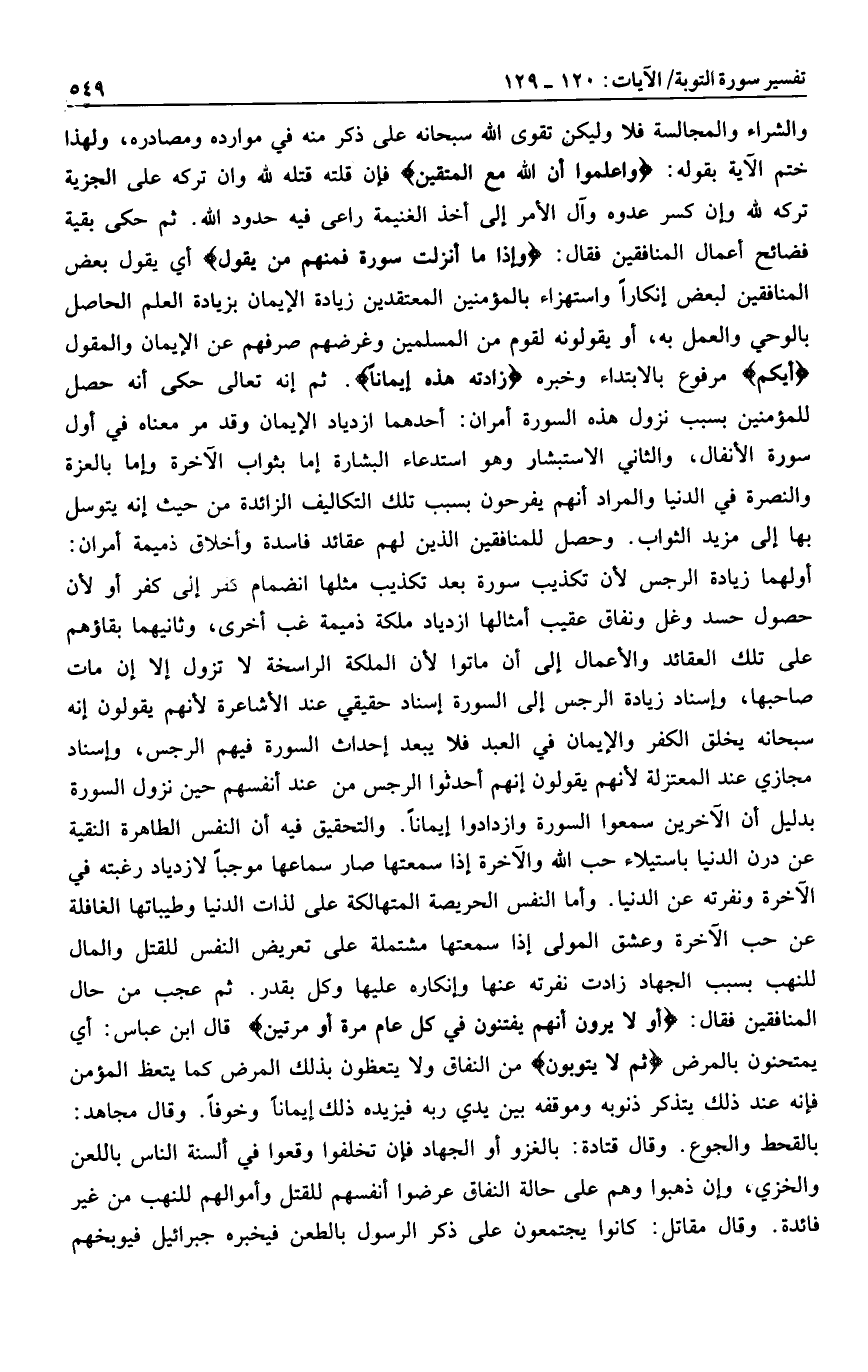 والشراء والمجالسة فلا وليكن تقوى الله سبحانه على ذكر منه في موارده ومصادره، ولهذا ختم الآية بقوله: وَاعْلَمُوا أَنَّ اللَّهَ مَعَ الْمُتَّقِينَ فإن قلته قتله لله وان تركه على الجزية تركه لله وإن كسر عدوه وآل الأمر إلى أخذ الغنيمة راعى فيه حدود الله. ثم حكى بقية فضائح أعمال المنافقين فقال: وَإِذا ما أُنْزِلَتْ سُورَةٌ فَمِنْهُمْ مَنْ يَقُولُ أي يقول بعض المنافقين لبعض إنكارا واستهزاء بالمؤمنين المعتقدين زيادة الإيمان بزيادة العلم الحاصل بالوحي والعمل به، أو يقولونه لقوم من المسلمين وغرضهم صرفهم عن الإيمان والمقول أَيُّكُمْ مرفوع بالابتداء وخبره زادَتْهُ هذِهِ إِيماناً. ثم إنه تعالى حكى أنه حصل للمؤمنين بسبب نزول هذه السورة أمران: أحدهما ازدياد الإيمان وقد مر معناه في أول سورة الأنفال، والثاني الاستبشار وهو استدعاء البشارة إما بثواب الآخرة وإما بالعزة والنصرة في الدنيا والمراد أنهم يفرحون بسبب تلك التكاليف الزائدة من حيث إنه يتوسل بها إلى مزيد الثواب. وحصل للمنافقين الذين لهم عقائد فاسدة وأخلاق ذميمة أمران: