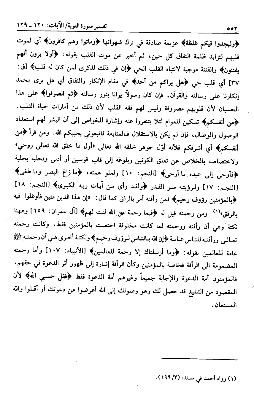 ومن رحمته قيل له فَبِما رَحْمَةٍ مِنَ اللَّهِ لِنْتَ لَهُمْ [آل عمران: 159] وهاهنا نكتة وهي أن رأفته ورحمته لما كانت مخلوقة اختصت بالمؤمنين فقط، وكانت رحمته تعالى ورأفته للناس عامة إِنَّ اللَّهَ بِالنَّاسِ لَرَؤُفٌ رَحِيمٌ ونكتة أخرى هي أن رحمته صلى الله عليه وسلم عامة للعالمين بقوله: وَما أَرْسَلْناكَ إِلَّا رَحْمَةً لِلْعالَمِينَ [الأنبياء: 107] وأما رحمته المضمومة الى الرأفة فخاصة بالمؤمنين وكأن الرأفة إشارة إلى ظهور أثر الدعوة في حقهم، فالمؤمنون أمة الدعوة والإجابة جميعا وغيرهم أمة الدعوة فقط فَقُلْ حَسْبِيَ اللَّهُ لأن المقصود من التبليغ قد حصل لك وهو وصولك إلى الله أعرضوا عن دعوتك أو أقبلوا والله المستعان.
