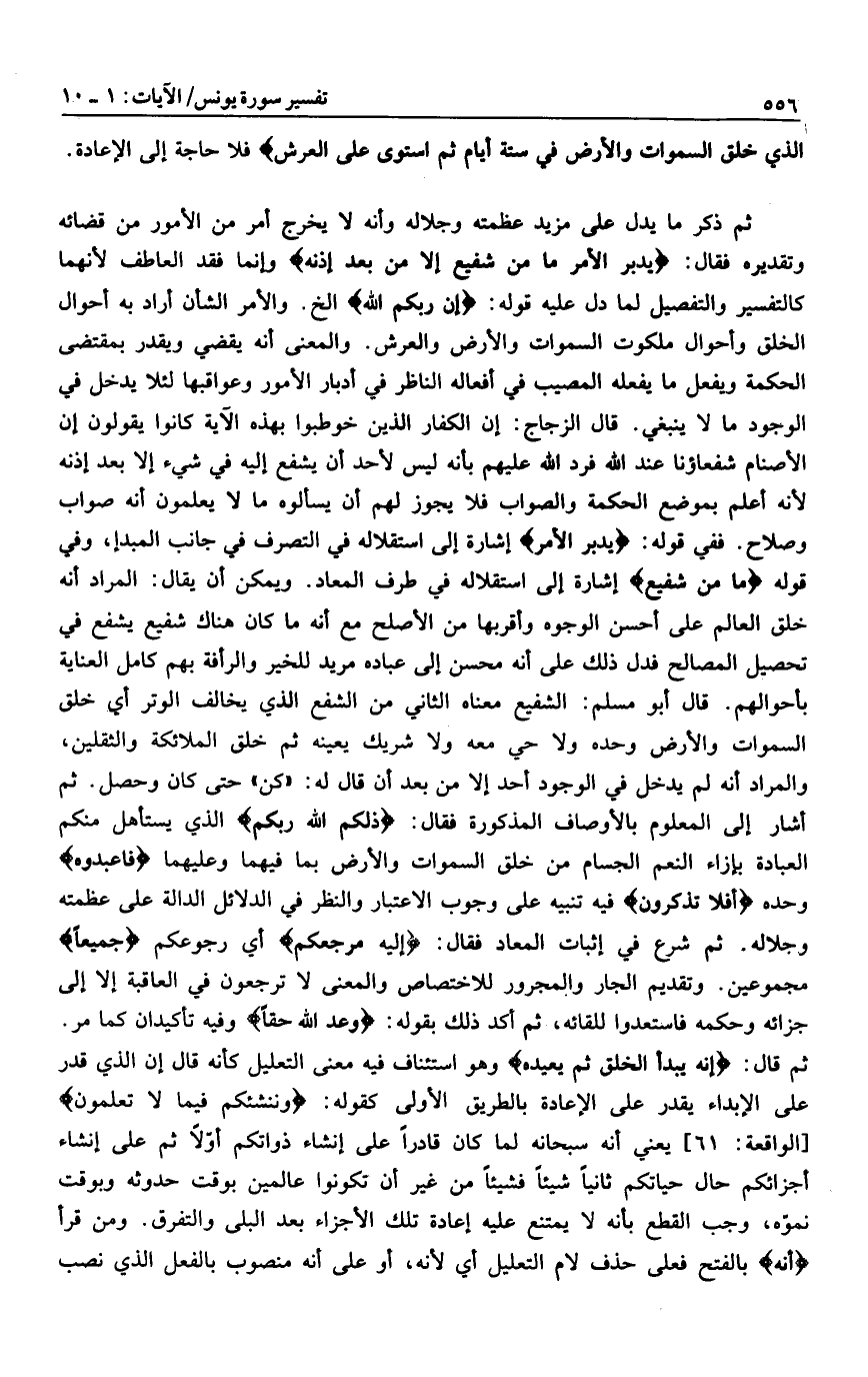 ثم ذكر ما يدل على مزيد عظمته وجلاله وأنه لا يخرج أمر من الأمور من قضائه وتقديره فقال: يُدَبِّرُ الْأَمْرَ ما مِنْ شَفِيعٍ إِلَّا مِنْ بَعْدِ إِذْنِهِ وإنما فقد العاطف لأنهما كالتفسير والتفصيل لما دل عليه قوله: إِنَّ رَبَّكُمُ اللَّهُ إلخ. والأمر الشأن أراد به أحوال الخلق وأحوال ملكوت السموات والأرض والعرش. والمعنى أنه يقضي ويقدر بمقتضى الحكمة ويفعل ما يفعله المصيب في أفعاله الناظر في أدبار الأمور وعواقبها لئلا يدخل في الوجود ما لا ينبغي. قال الزجاج: إن الكفار الذين خوطبوا بهذه الآية كانوا يقولون إن الأصنام شفعاؤنا عند الله فرد الله عليهم بأنه ليس لأحد أن يشفع إليه في شيء إلا بعد إذنه لأنه أعلم بموضع الحكمة والصواب فلا يجوز لهم أن يسألوه ما لا يعلمون أنه صواب وصلاح. ففي قوله: يُدَبِّرُ الْأَمْرَ إشارة إلى استقلاله في التصرف في جانب المبدإ، وفي قوله ما مِنْ شَفِيعٍ إشارة إلى استقلاله في طرف المعاد. ويمكن أن يقال: المراد أنه خلق العالم على أحسن الوجوه وأقربها من الأصلح مع أنه ما كان هناك شفيع يشفع في تحصيل المصالح فدل ذلك على أنه محسن إلى عباده مريد للخير والرأفة بهم كامل العناية بأحوالهم. قال أبو مسلم: الشفيع معناه الثاني من الشفع الذي يخالف الوتر أي خلق السموات والأرض وحده ولا حي معه ولا شريك يعينه ثم خلق الملائكة والثقلين، والمراد أنه لم يدخل في الوجود أحد إلا من بعد أن قال له: «كن» حتى كان وحصل. ثم أشار إلى المعلوم بالأوصاف المذكورة فقال: ذلِكُمُ اللَّهُ رَبُّكُمْ الذي يستأهل منكم العبادة بإزاء النعم الجسام من خلق السموات والأرض بما فيهما وعليهما فَاعْبُدُوهُ وحده أَفَلا تَذَكَّرُونَ فيه تنبيه على وجوب الاعتبار والنظر في الدلائل الدالة على عظمته وجلاله. ثم شرع في إثبات المعاد فقال: إِلَيْهِ مَرْجِعُكُمْ أي رجوعكم جَمِيعاً مجموعين. وتقديم الجار والمجرور للاختصاص والمعنى لا ترجعون في العاقبة إلا إلى جزائه وحكمه فاستعدوا للقائه، ثم أكد ذلك بقوله: وَعْدَ اللَّهِ حَقًّا وفيه تأكيدان كما مر.