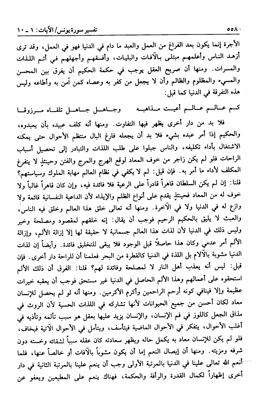 الأجرة إنما يكون بعد الفراغ من العمل والعبد ما دام في الدنيا فهو في العمل، وقد ترى أزهد الناس وأعلمهم مبتلى بالآفات والبليات، وأفسقهم وأجهلهم في أتم اللذات والمسرات. ومنها أن صريح العقل يوجب في حكمة الحكيم أن يفرق بين المحسن والمسيء والمظلوم والظالم وأن لا يجعل من كفر به وعصاه كمن آمن به وأطاعه وليس هذه التفرقة في الدنيا كما قيل: