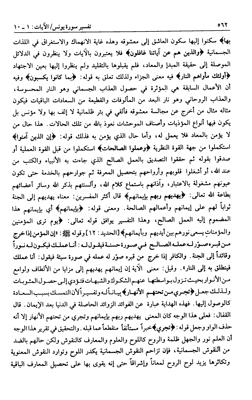 وقيل: معنى الآية إن إيمانهم يهديهم إلى مزايا من الألطاف ولوامع من الأنوار بحيث تزول بواسطتها عنهم الشكوك والشبهات فتؤدي إلى حصول المثوبات ولذلك جعل تَجْرِي مِنْ تَحْتِهِمُ الْأَنْهارُ بيانا له وتفسيرا لأن التمسك بسبب السعادة كالوصول إليها. فهذه الهداية عبارة عن الفوائد الزوائد الحاصلة في الدنيا بعد الإيمان. قال القفال: فعلى هذا الوجه كان المعنى يهديهم ربهم بإيمانهم وتجري من تحتهم الأنهار إلا أنه حذف الواو وجعل قوله: تَجْرِي خبرا مستأنفا منقطعا عما قبله. والتحقيق في تقرير هذا الوجه أن العلم نور والجهل ظلمة والروح كاللوح والعلوم والمعارف كالنقوش ولكن حالهم بالضد من النقوش الجسمانية، فإن تزاحم النقوش الجسمانية يكدر اللوح وتوارد النقوش المعنوية وتكاثرها يزيد لوح الروح لمعانا وإشراقا حتى إنه يقوى بها على تحصيل المعارف الباقية