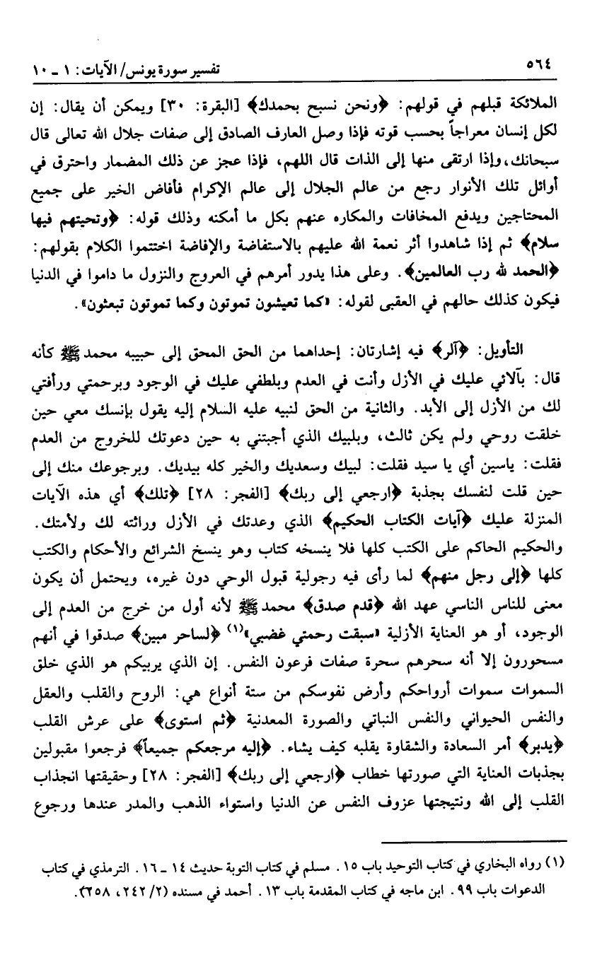 الملائكة قبلهم في قولهم: وَنَحْنُ نُسَبِّحُ بِحَمْدِكَ [البقرة: 30] ويمكن أن يقال: إن لكل إنسان معراجا بحسب قوته فإذا وصل العارف الصادق إلى صفات جلال الله تعالى قال سبحانك، وإذا ارتقى منها إلى الذات قال اللهم، فإذا عجز عن ذلك المضمار واحترق في أوائل تلك الأنوار رجع من عالم الجلال إلى عالم الإكرام فأفاض الخير على جميع المحتاجين ويدفع المخافات والمكاره عنهم بكل ما أمكنه وذلك قوله: وَتَحِيَّتُهُمْ فِيها سَلامٌ ثم إذا شاهدوا أثر نعمة الله عليهم بالاستفاضة والإفاضة اختتموا الكلام بقولهم: