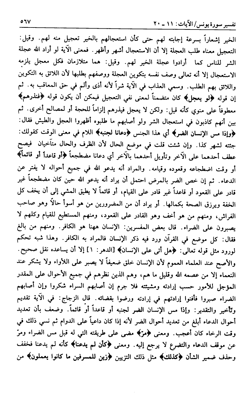والأصح عند العلماء العموم لأن الإنسان خلق ضعيفا لا يصبر على اللأواء ولا يشكر عند النعماء إلا من عصمه الله وقليل ما هم، وهم الذين نظرهم في جميع الأحوال على المقدر المؤجل للأمور حسب إرادته ومشيئته فلا جرم إن أصابهم السراء شكروا وإن أصابهم الضراء صبروا فأفنوا إرادتهم في إرادته ورضوا بقضائه. قال الزجاج: في الآية تقديم وتأخير والتقدير: وإذا مس الإنسان الضر لجنبه أو قاعدا أو قائما. وضعف بأن تعديد أحوال الدعاء أبلغ من تعديد أحوال الضر لأنه إذا كان داعيا على الدوام ثم نسي ذلك في وقت الرخاء كان أعجب. ومعنى مَرَّ مضى على طريقته التي له قبل مس الضراء ومرّ عن موقف الدعاء والتضرع لا يرجع إليه. ومعنى كَأَنْ لَمْ يَدْعُنا كأنه لم يدعنا فخفف وحذف ضمير الشأن كَذلِكَ مثل ذلك التزيين زُيِّنَ لِلْمُسْرِفِينَ ما كانُوا يَعْمَلُونَ من