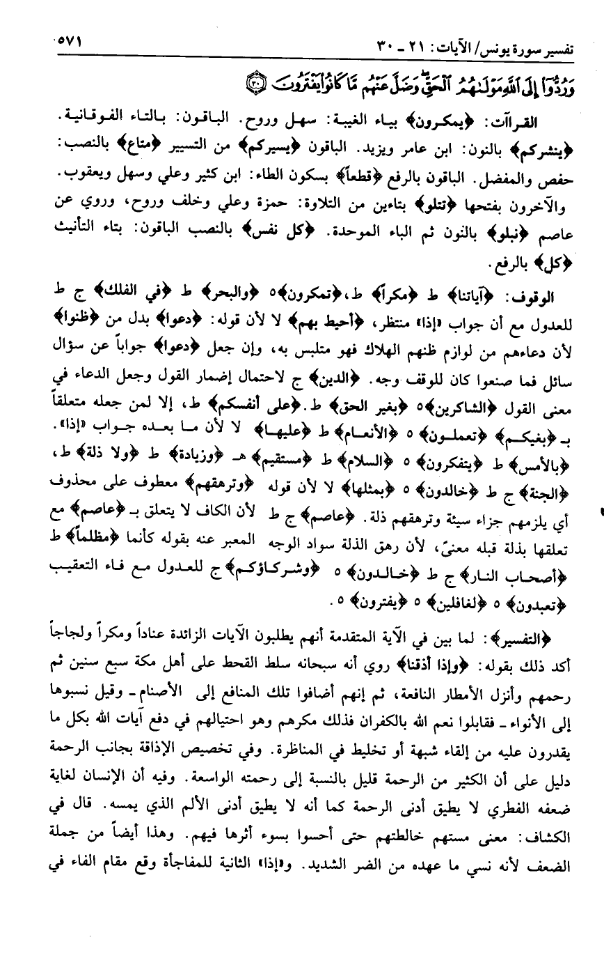 بِالْأَمْسِ ط يَتَفَكَّرُونَ هـ السَّلامِ ط مُسْتَقِيمٍ هـ وَزِيادَةٌ ط وَلا ذِلَّةٌ ط، الْجَنَّةِ ج ط خالِدُونَ هـ بِمِثْلِها لا لأن قوله وَتَرْهَقُهُمْ معطوف على محذوف أي يلزمهم جزاء سيئة وترهقهم ذلة. عاصِمٍ ج ط لأن الكاف لا يتعلق ب عاصِمٍ مع تعلقها بذلة قبله معنى، لأن رهق الذلة سواد الوجه المعبر عنه بقوله كأنما مُظْلِماً ط أَصْحابُ النَّارِ ج ط خالِدُونَ هـ وَشُرَكاؤُكُمْ ج للعدول مع فاء التعقيب تَعْبُدُونَ هـ لَغافِلِينَ هـ يَفْتَرُونَ هـ.