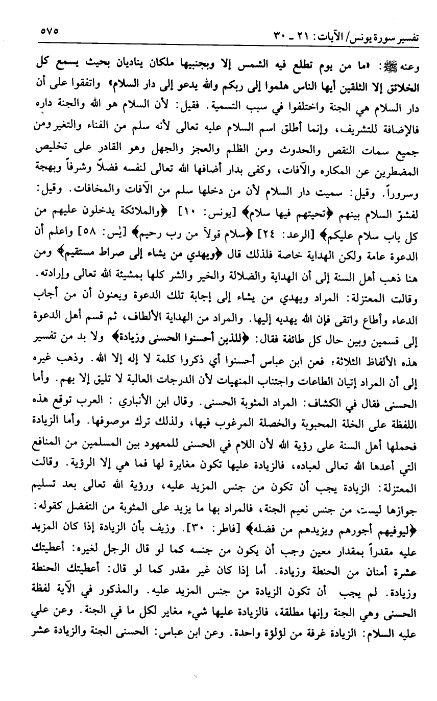 لِيُوَفِّيَهُمْ أُجُورَهُمْ وَيَزِيدَهُمْ مِنْ فَضْلِهِ [فاطر: 30] . وزيف بأن الزيادة إذا كان المزيد عليه مقدرا بمقدار معين وجب أن يكون من جنسه كما لو قال الرجل لغيره: أعطيتك عشرة أمنان من الحنطة وزيادة. أما إذا كان غير مقدر كما لو قال: أعطيتك الحنطة وزيادة. لم يجب أن تكون الزيادة من جنس المزيد عليه. والمذكور في الآية لفظة الحسنى وهي الجنة وإنها مطلقة، فالزيادة عليها شيء مغاير لكل ما في الجنة.