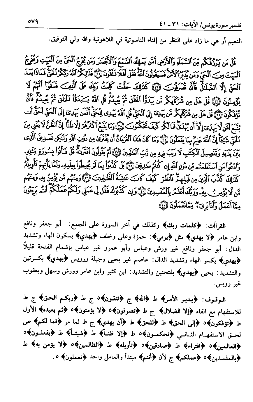 يُدَبِّرُ الْأَمْرَ ط اللَّهُ ج تَتَّقُونَ هـ ج ط رَبُّكُمُ الْحَقُّ ج ط للاستفهام مع الفاء إِلَّا الضَّلالُ ج ط تُصْرَفُونَ هـ لا يُؤْمِنُونَ هـ ثُمَّ يُعِيدُهُ الأول ط تُؤْفَكُونَ هـ إِلَى الْحَقِّ ط لِلْحَقِّ ط أَنْ يُهْدى ج ط لما مر فَما لَكُمْ ص لحق الاستفهام الثاني تَحْكُمُونَ هـ ط إِلَّا ظَنًّا ط شَيْئاً ط يَفْعَلُونَ هـ الْعالَمِينَ هـ افْتَراهُ ط صادِقِينَ هـ تَأْوِيلُهُ ط الظَّالِمِينَ هـ لا يُؤْمِنُ بِهِ ط بِالْمُفْسِدِينَ هـ عَمَلُكُمْ ج لأن أَنْتُمْ مبتدأ والعامل واحد تَعْمَلُونَ هـ.