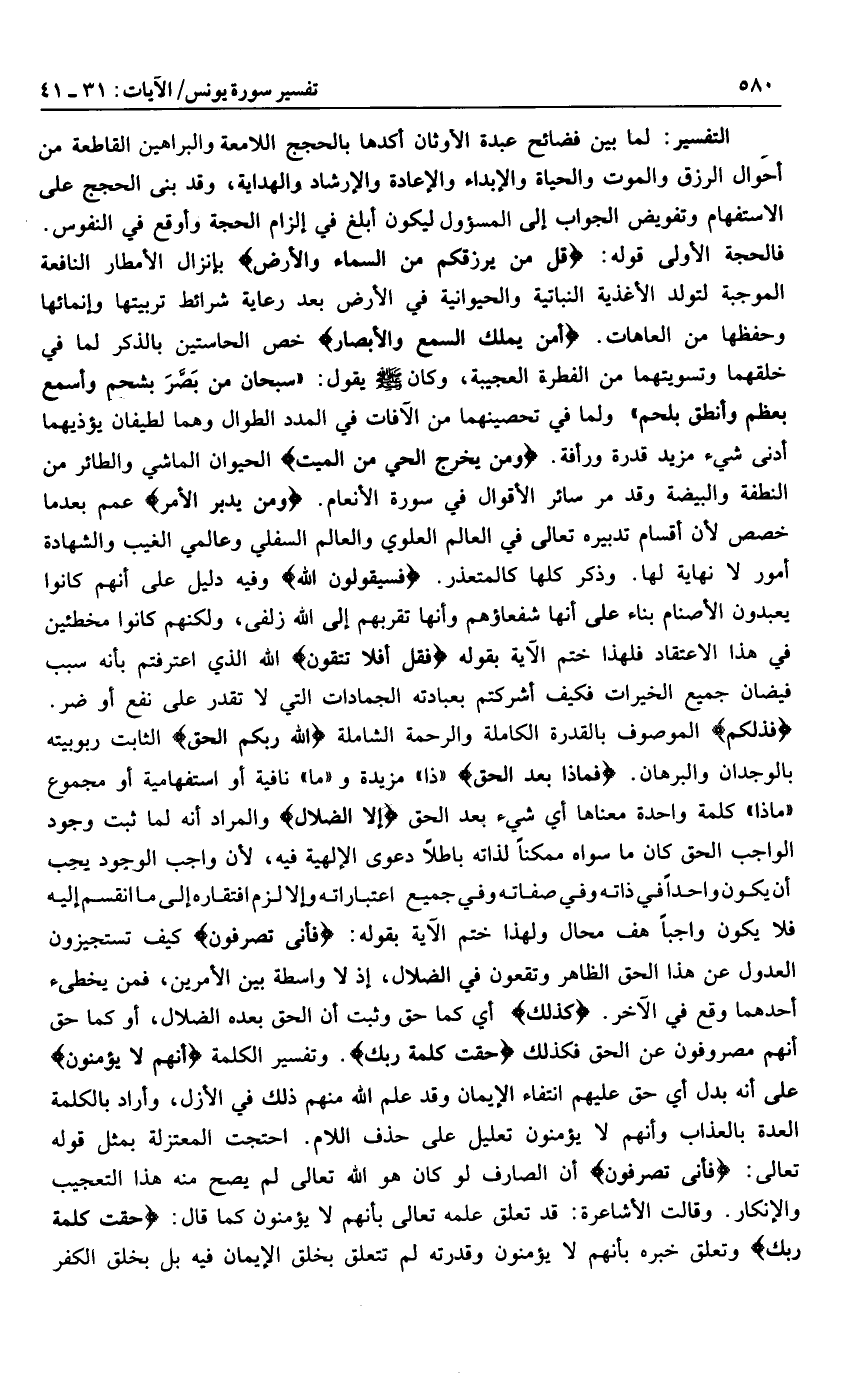 فَذلِكُمُ الموصوف بالقدرة الكاملة والرحمة الشاملة اللَّهُ رَبُّكُمُ الْحَقُّ الثابت ربوبيته بالوجدان والبرهان. فَماذا بَعْدَ الْحَقِّ «ذا» مزيدة و «ما» نافية أو استفهامية أو مجموع «ماذا» كلمة واحدة معناها أي شيء بعد الحق إِلَّا الضَّلالُ والمراد أنه لما ثبت وجود الواجب الحق كان ما سواه ممكنا لذاته باطلا دعوى الإلهية فيه، لأن واجب الوجود يجب أن يكون واحدا في ذاته وفي صفاته وفي جميع اعتباراته وإلا لزم افتقاره إلى ما انقسم إليه فلا يكون واجبا هف محال ولهذا ختم الآية بقوله: فَأَنَّى تُصْرَفُونَ كيف تستجيزون العدول عن هذا الحق الظاهر وتقعون في الضلال، إذ لا واسطة بين الأمرين، فمن يخطىء أحدهما وقع في الآخر. كَذلِكَ أي كما حق وثبت أن الحق بعده الضلال، أو كما حق أنهم مصروفون عن الحق فكذلك حَقَّتْ كَلِمَةُ رَبِّكَ. وتفسير الكلمة أَنَّهُمْ لا يُؤْمِنُونَ على أنه بدل أي حق عليهم انتفاء الإيمان وقد علم الله منهم ذلك في الأزل، وأراد بالكلمة العدة بالعذاب وأنهم لا يؤمنون تعليل على حذف اللام. احتجت المعتزلة بمثل قوله تعالى: فَأَنَّى تُصْرَفُونَ أن الصارف لو كان هو الله تعالى لم يصح منه هذا التعجيب والإنكار. وقالت الأشاعرة: قد تعلق علمه تعالى بأنهم لا يؤمنون كما قال: حَقَّتْ كَلِمَةُ رَبِّكَ وتعلق خبره بأنهم لا يؤمنون وقدرته لم تتعلق بخلق الإيمان فيه بل بخلق الكفر